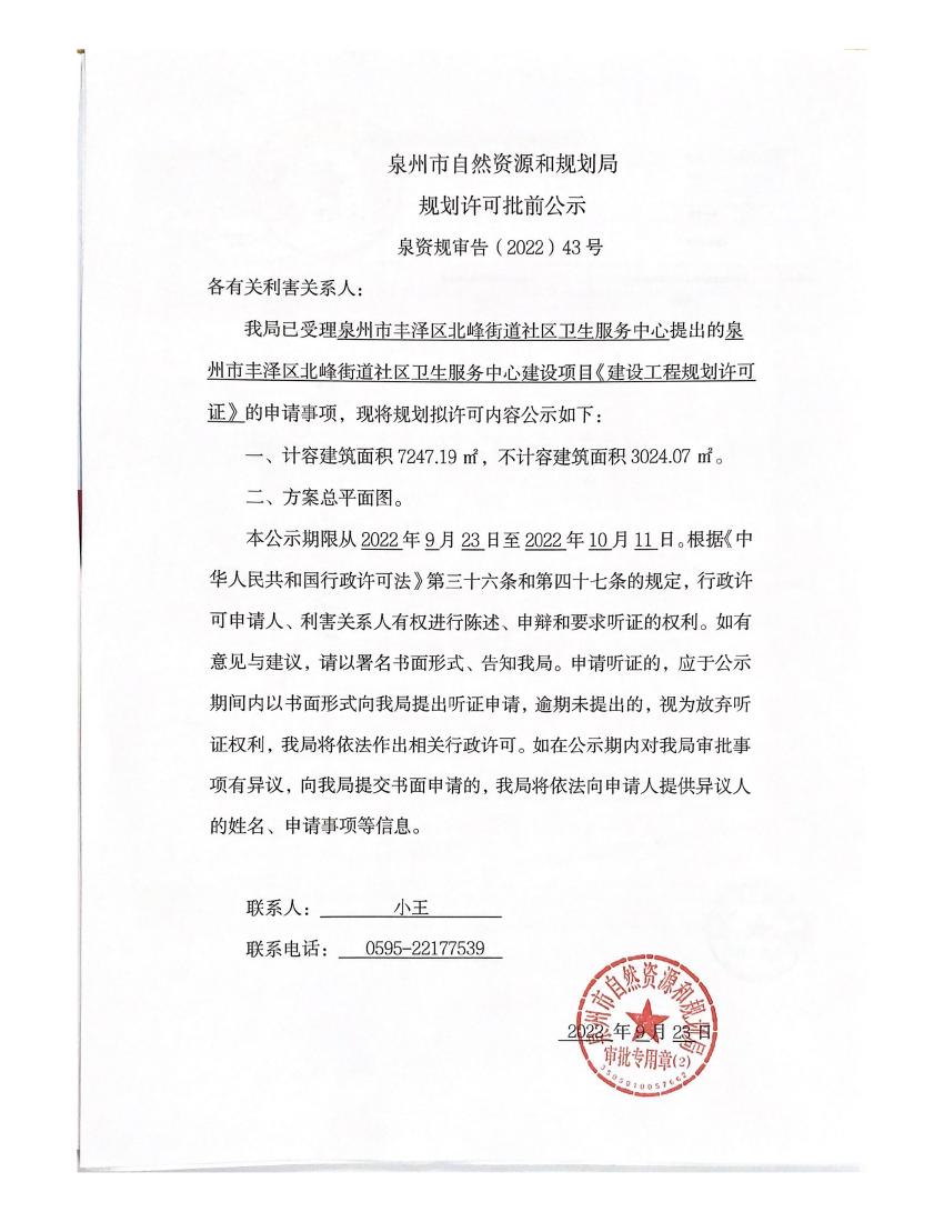 泉州市丰泽区北峰街道社区卫生服务中心建设项目《建设工程规划许可证》批前公示