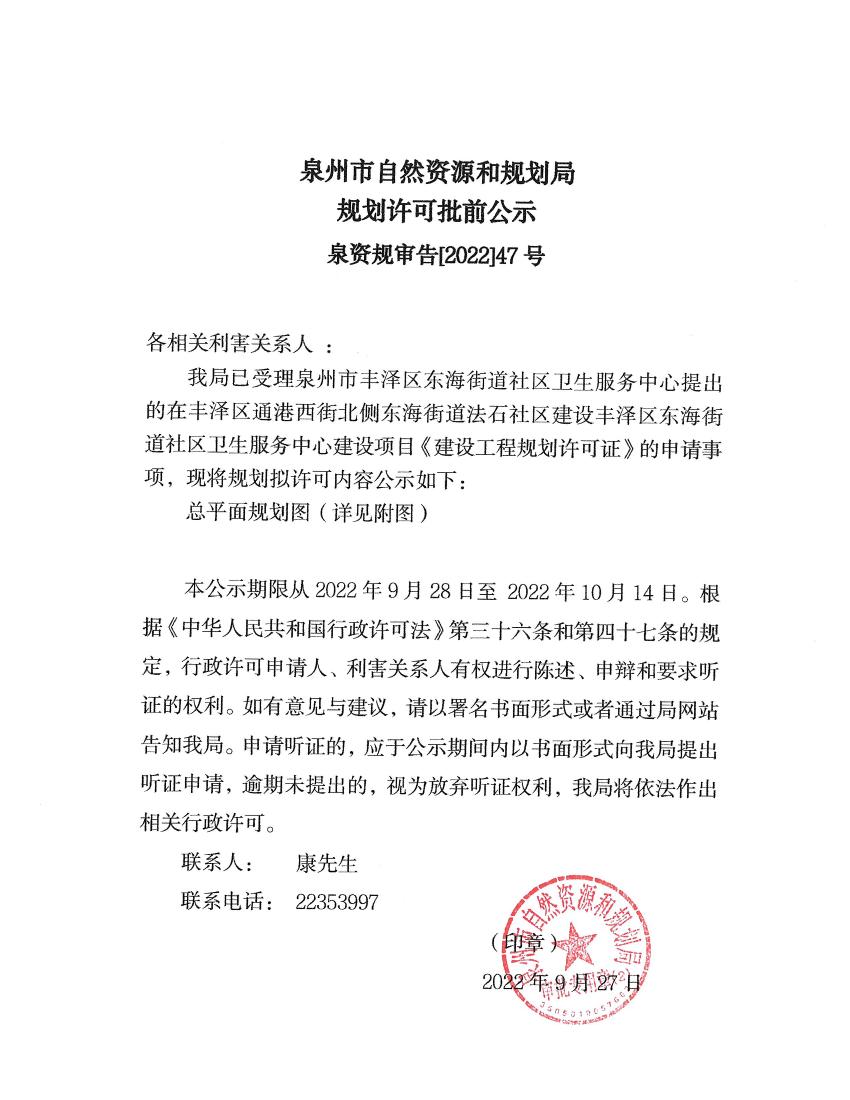 丰泽区东海街道社区卫生服务中心建设项目《建设工程规划许可证》批前公示