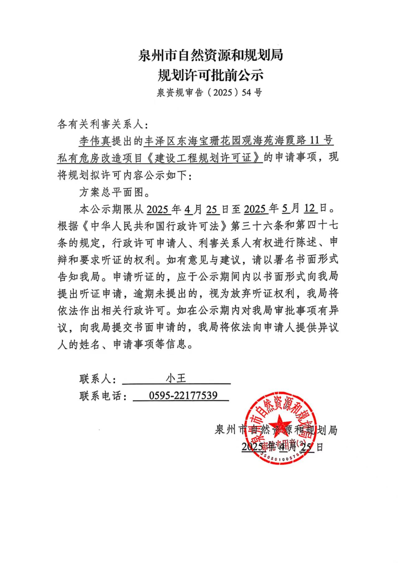 丰泽区东海宝珊花园观海苑海霞路11号私有危房改造项目《建设工程规划许可证》批前公示