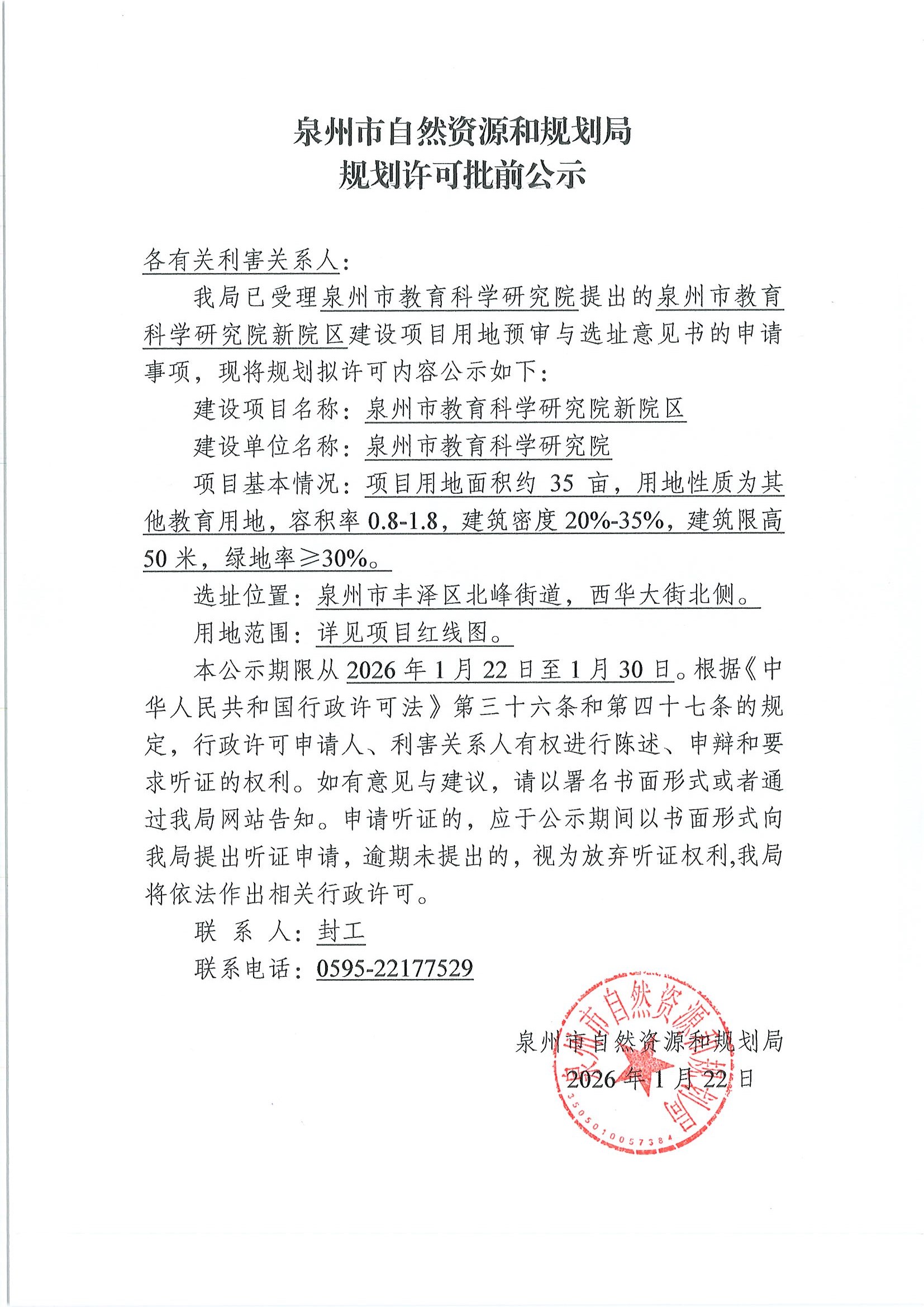 泉州市教育科学研究院新院区建设项目用地预审与选址意见书批前公示