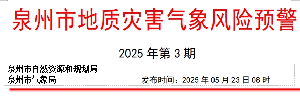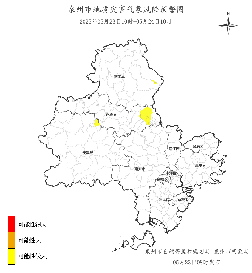 预计,05月23日10时至05月24日10时,安溪县白濑乡,永春县桃城镇、湖洋镇、东关镇,德化县南埕镇、水口镇,地质灾害气象风险等级为黄色预警,地质灾害发生可能性较大,应加强对地质灾害隐患点的监测和对高陡边坡、易发泥石流的沟口等易发区的巡查和防范,如果发现地灾险情应及时采取防灾避险措施,确保人民生命安全。