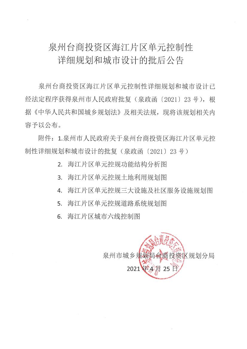 泉州台商投资区海江片区单元控制性详细规划和城市设计批后公告