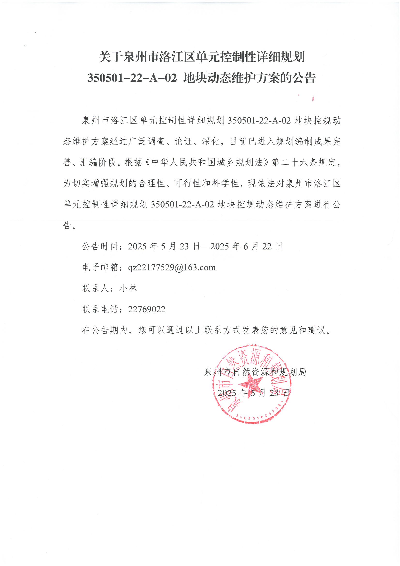 关于泉州市洛江区单元控制性详细规划350501一22一A一02地块动态维护方案的公告