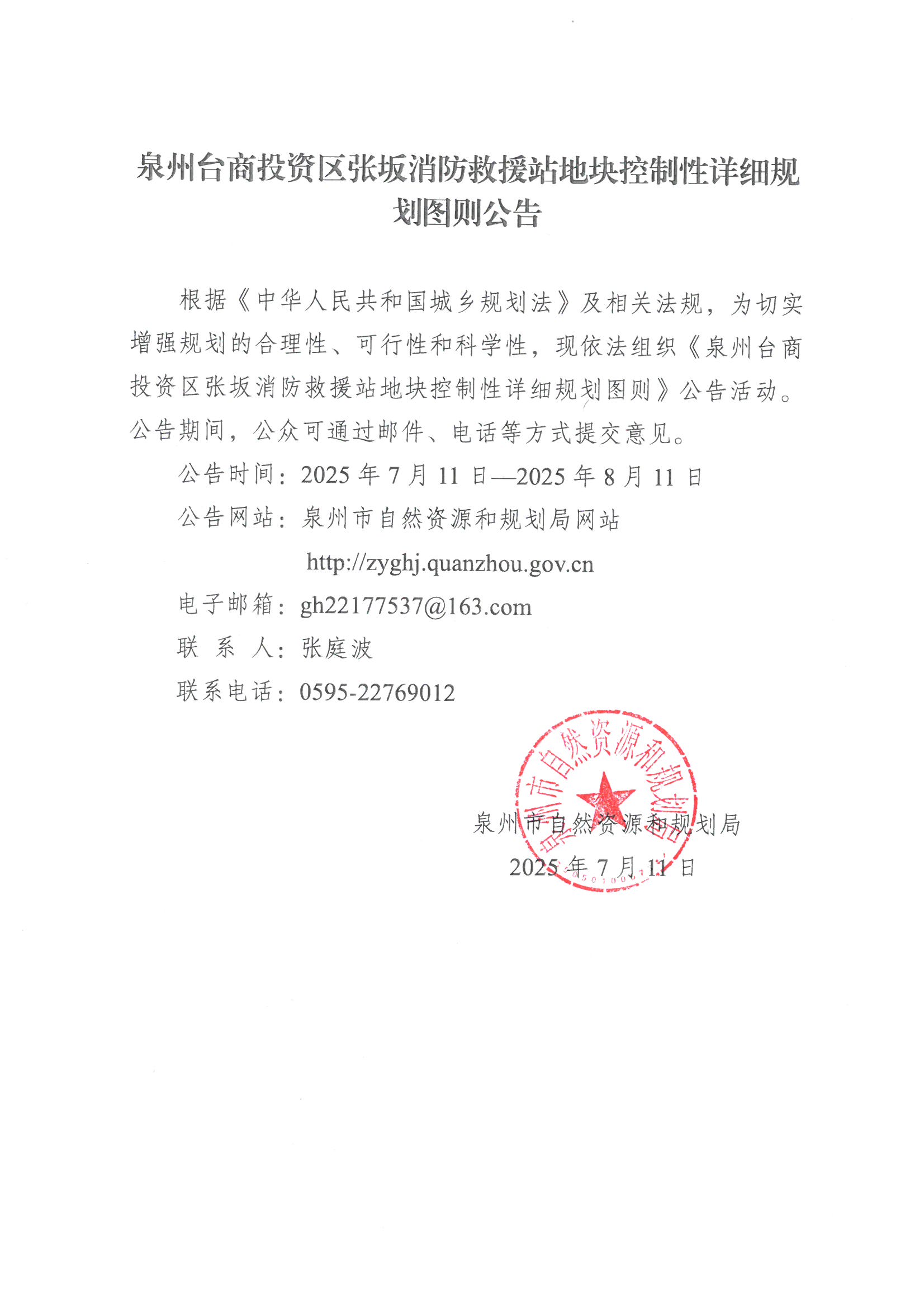 泉州台商投资区张坂消防救援站地块控制性详细规划图则公告