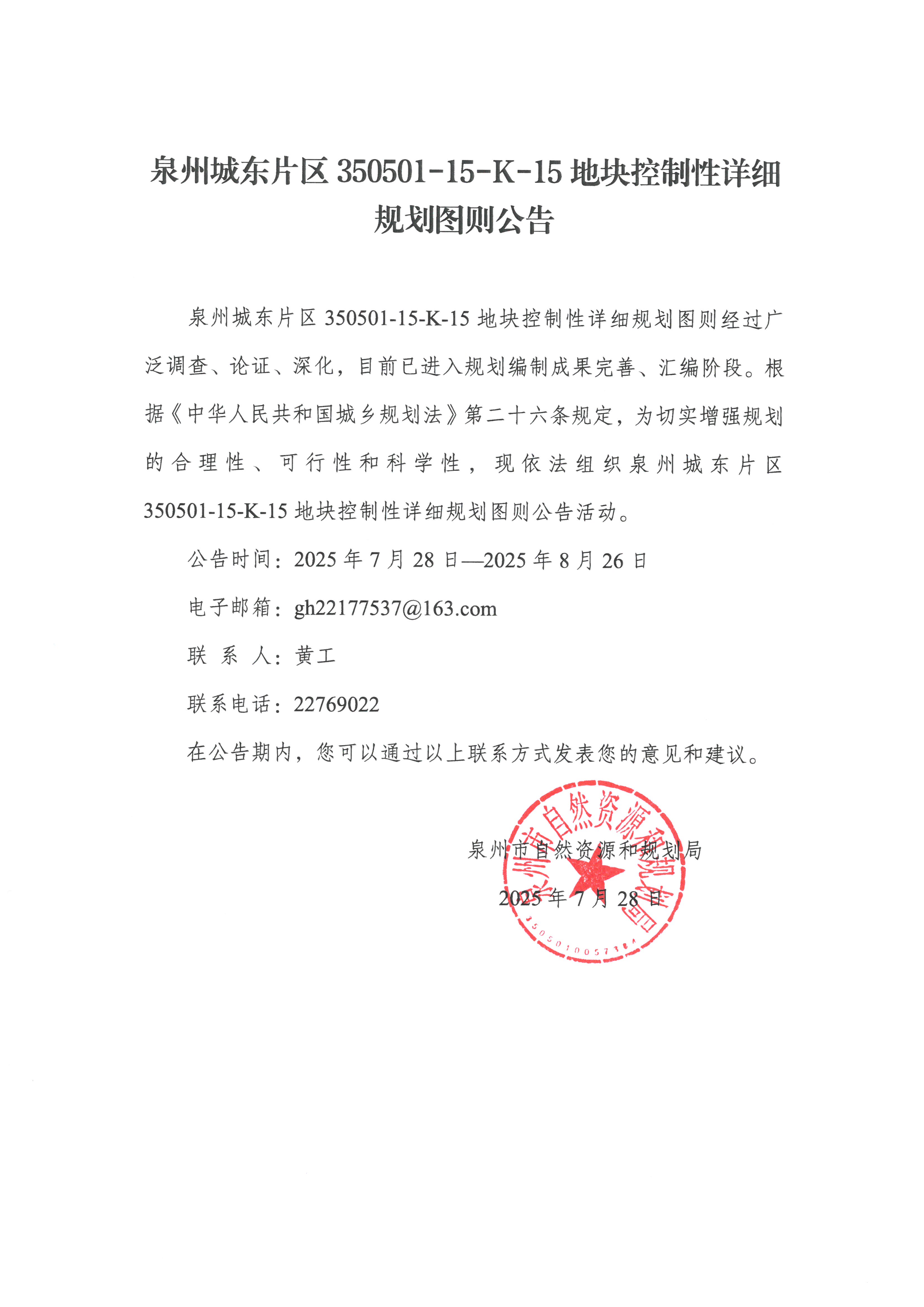 泉州城东片区350501-15-K-15地块控制性详细规划图则公告