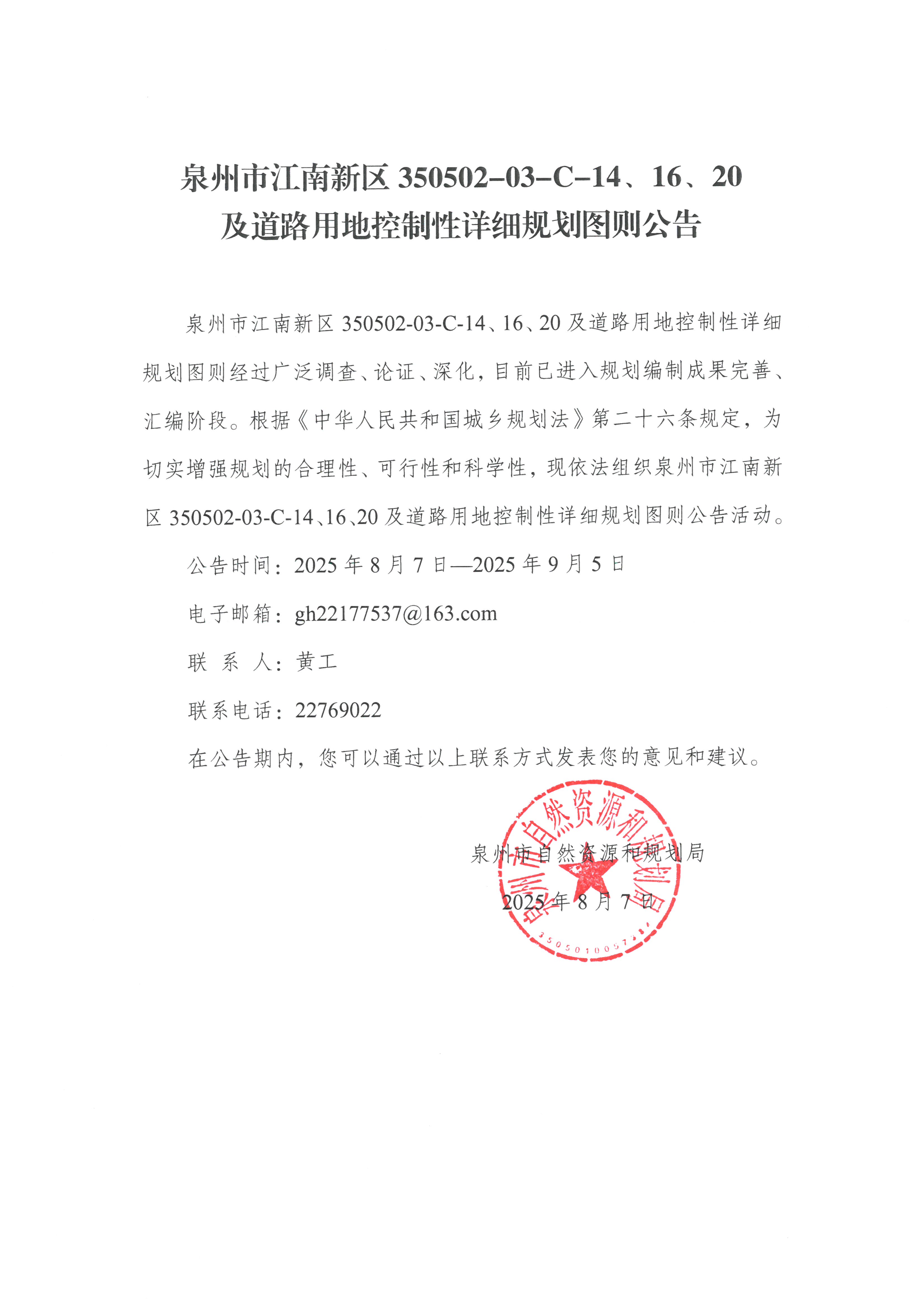 泉州市江南新区350502-03-C-14、16、20及道路用地控制性详细规划图则公告
