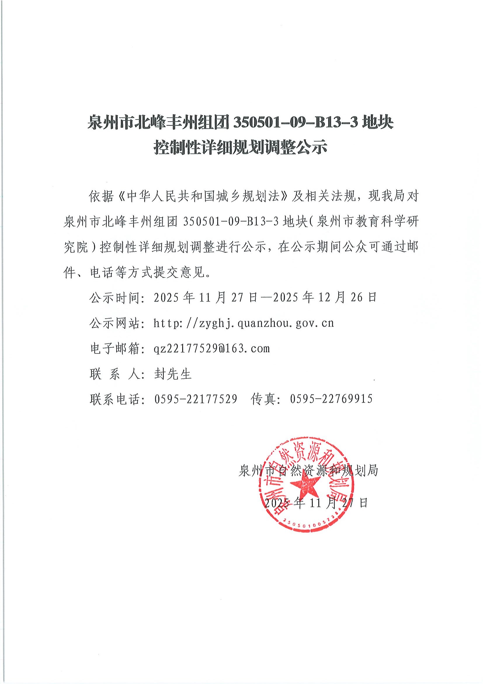 泉州市北峰丰州组团350501-09-B13-3地块控制性详细规划调整公示