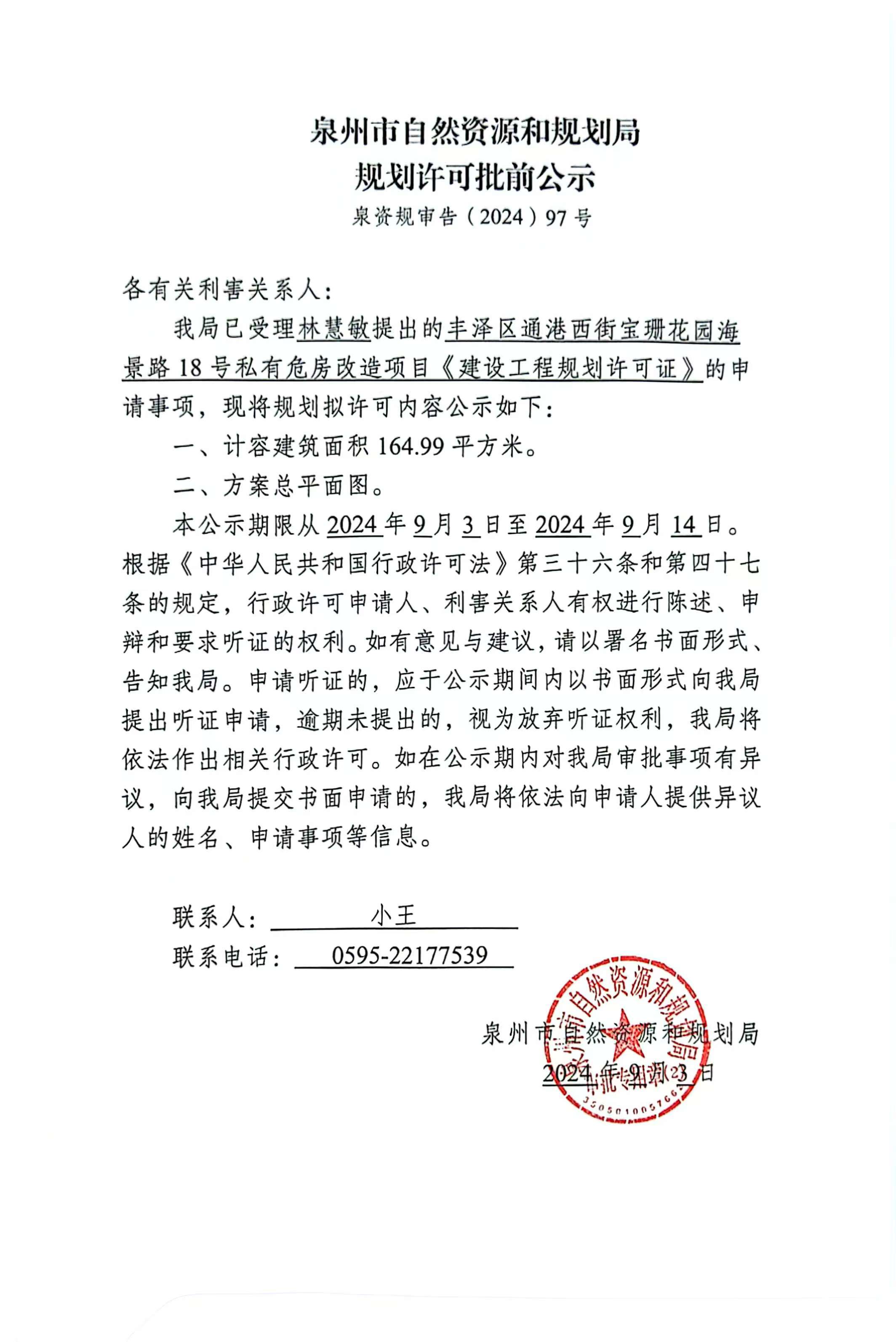 丰泽区通港西街宝珊花园海景路18号私有危房改造项目《建设工程规划许可证》批前公示