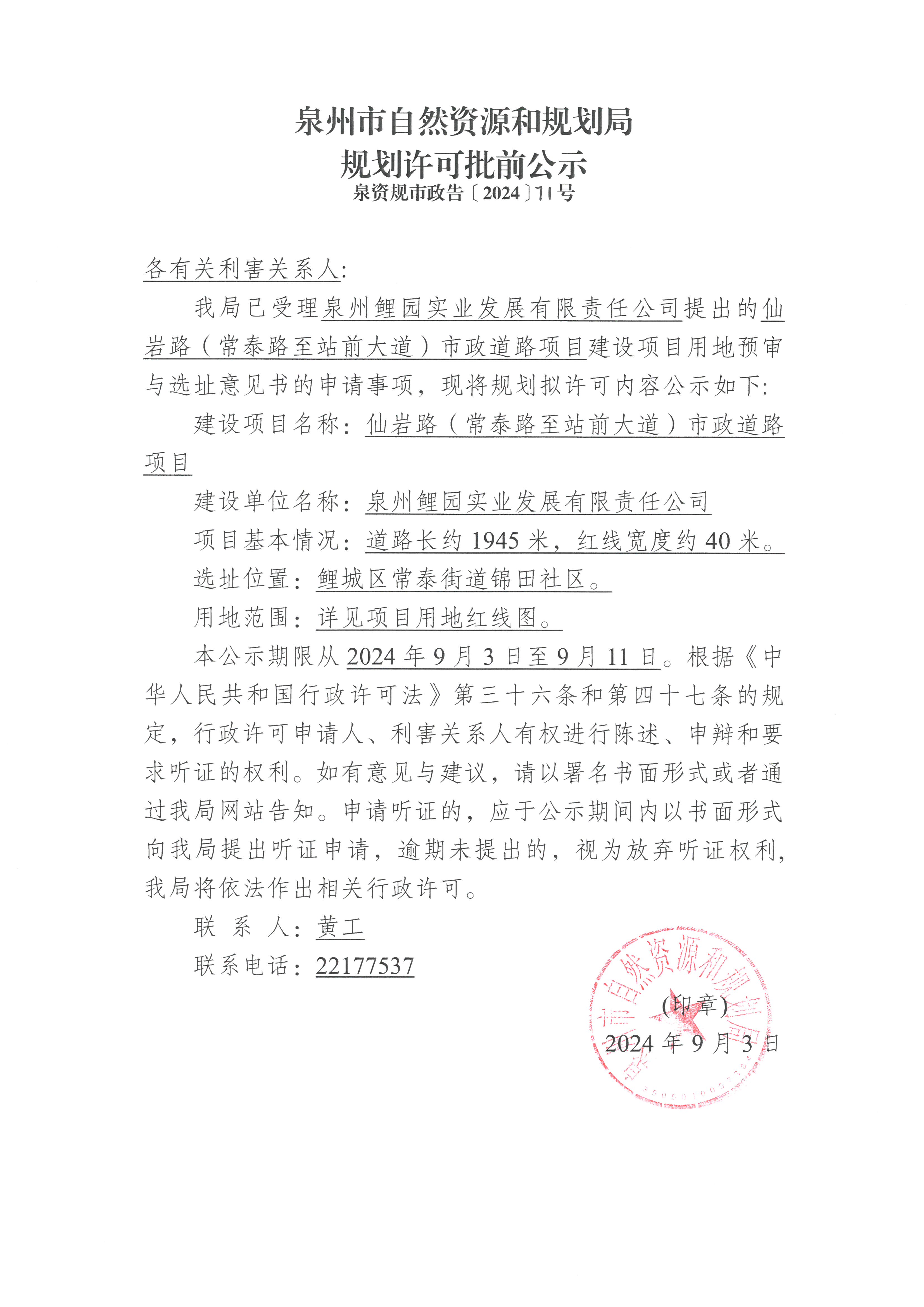 仙岩路(常泰路至站前大道)市政道路项目建设项目用地预审与选址意见书批前公示