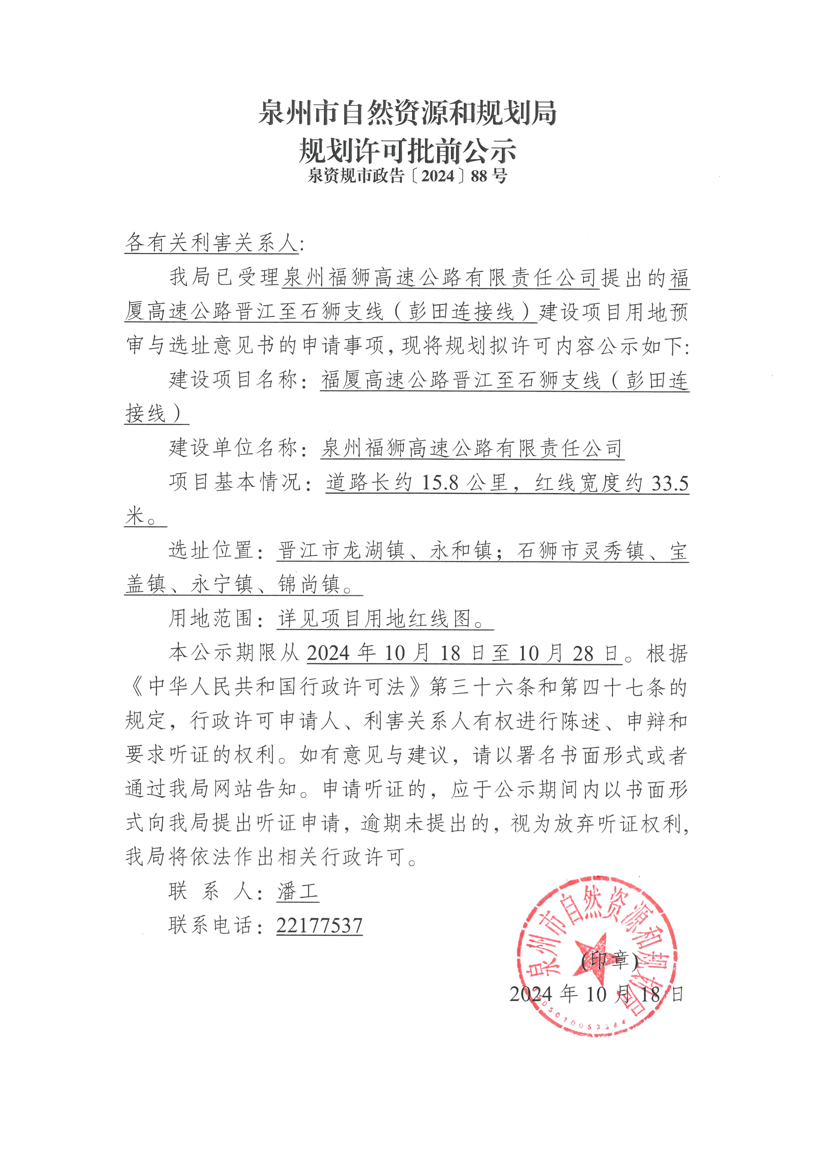 福厦高速公路晋江至石狮支线(彭田连接线)建设项目用地预审与选址意见书批前公示