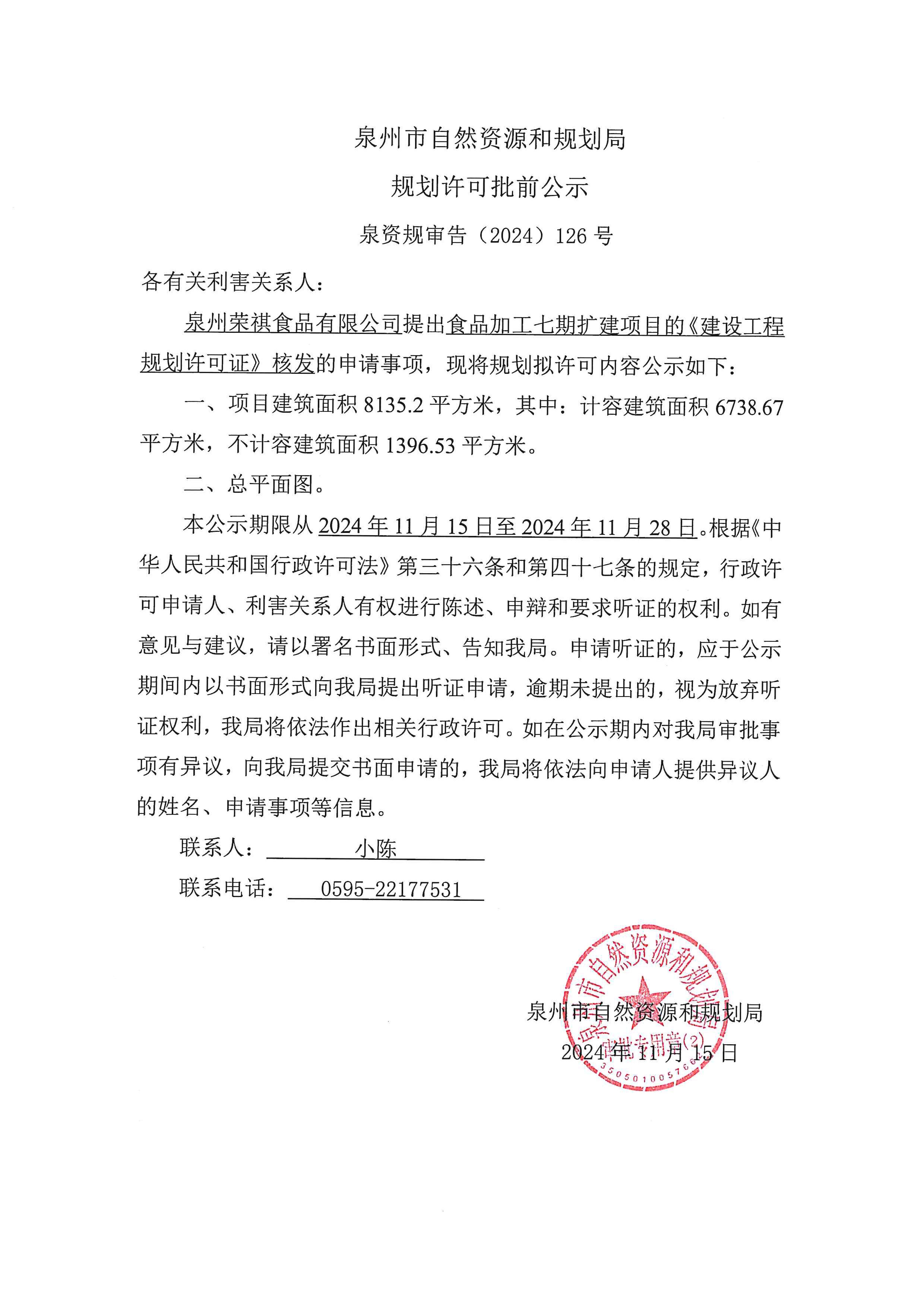 泉州荣祺食品有限公司食品加工七期扩建项目《建设工程规划许可证》批前公示