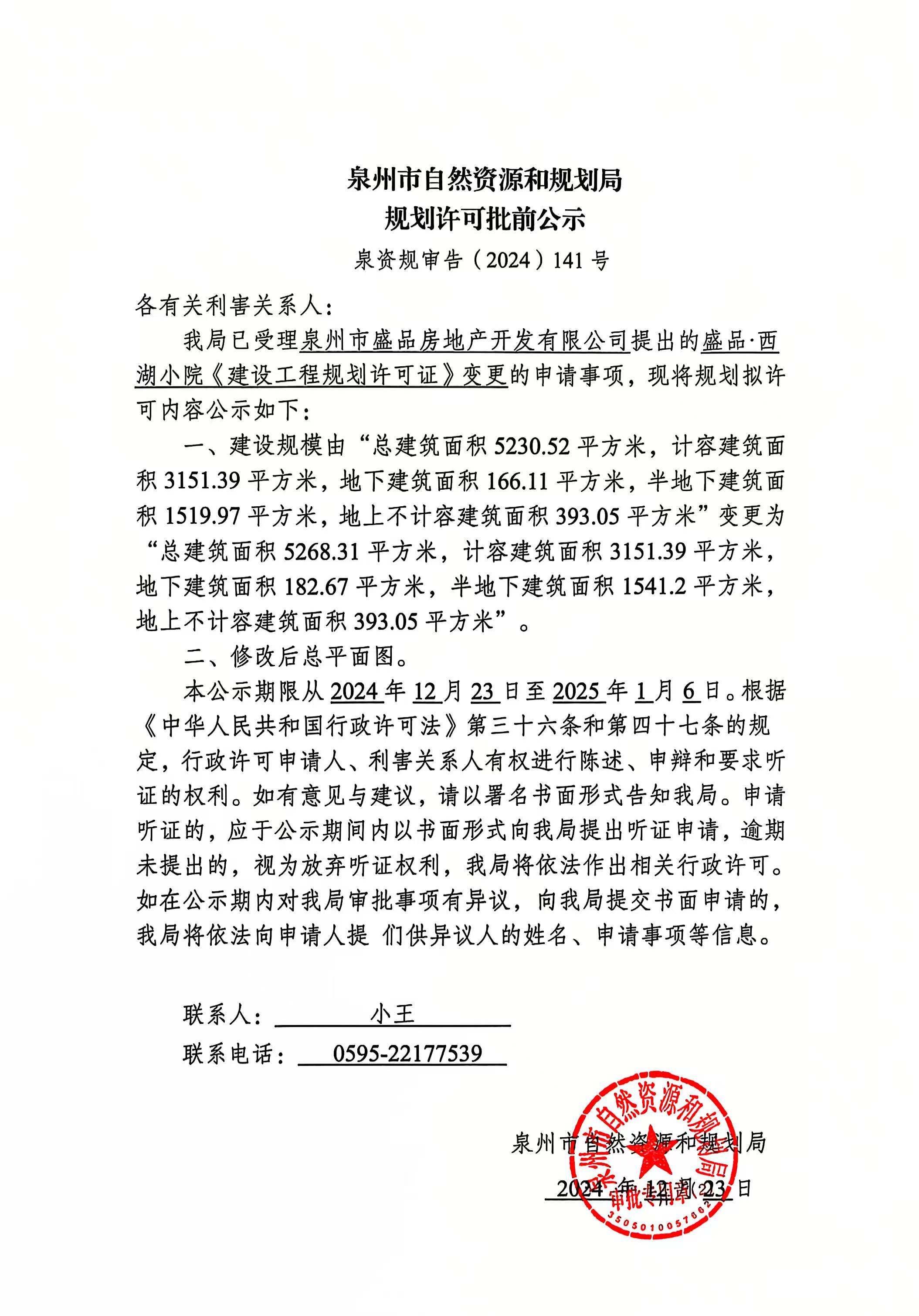 盛品·西湖小院《建设工程规划许可证》变更批前公示