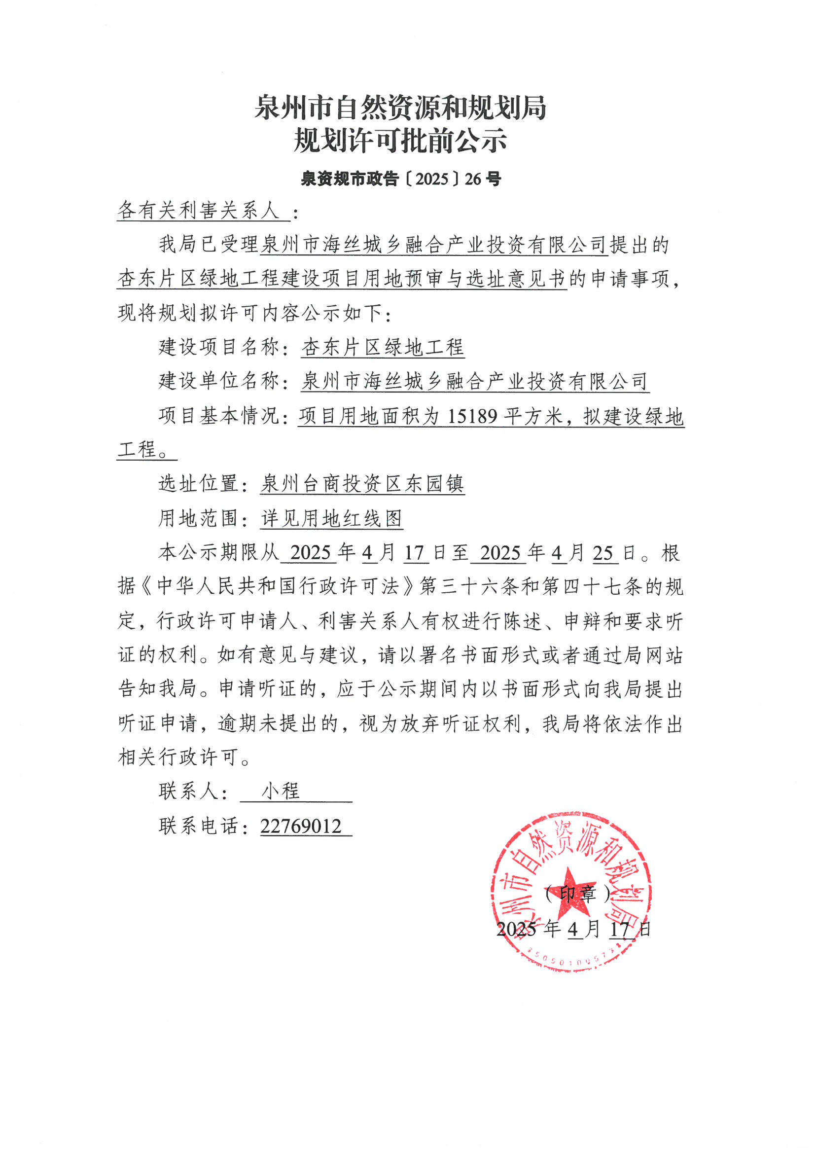 杏东片区绿地工程建设项目用地预审与选址意见书批前公示