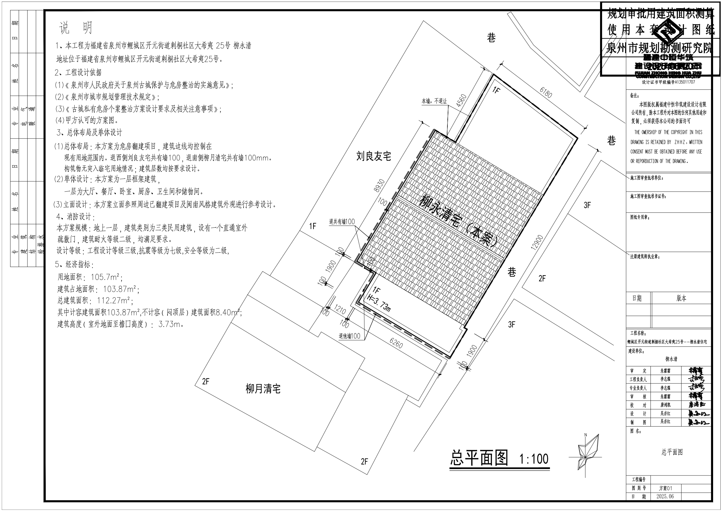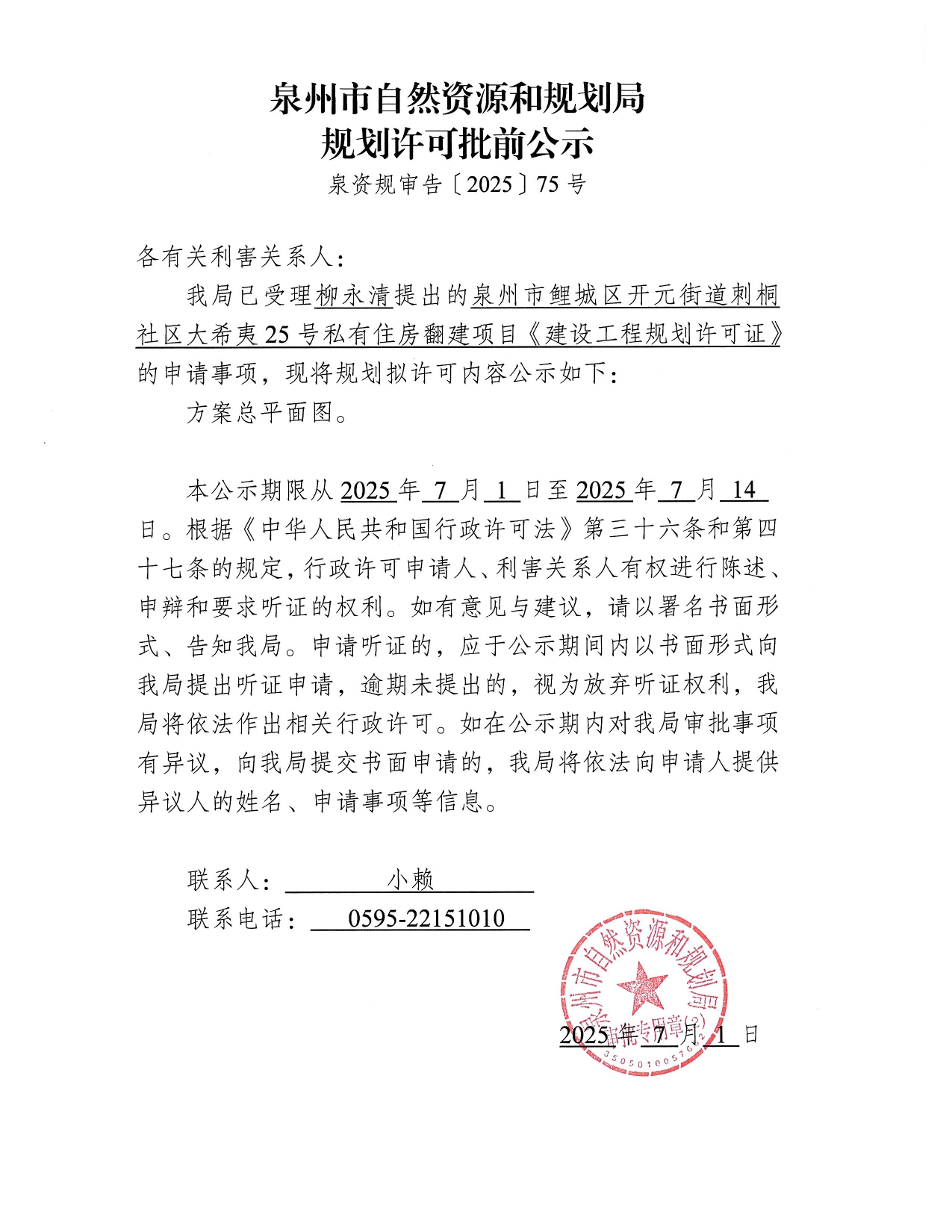 泉州市鲤城区开元街道刺桐社区大希夷25号私有住房翻建项目《建设工程规划许可证》批前公示