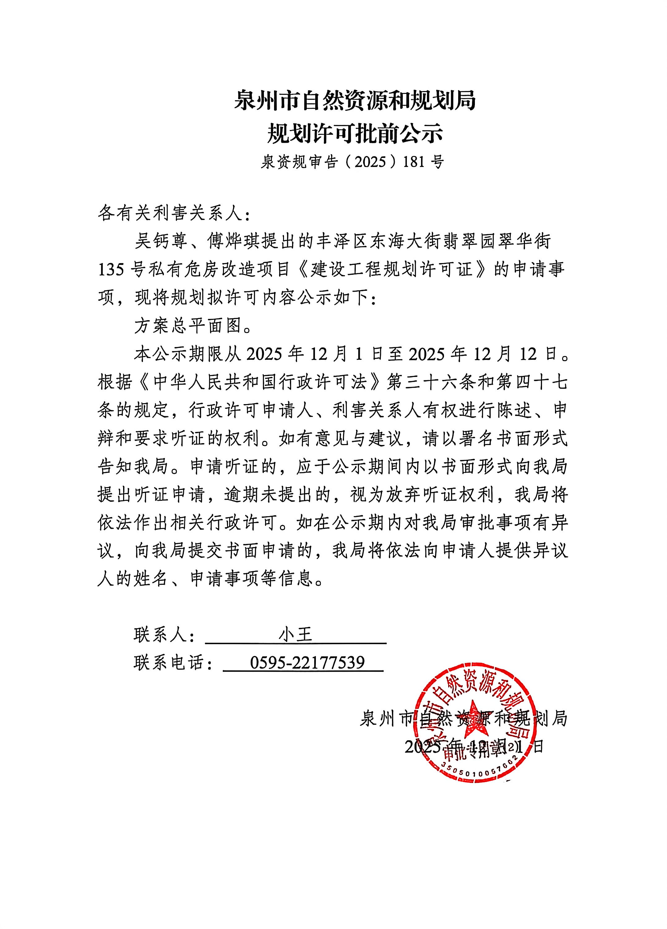 丰泽区东海大街翡翠园翠华街135号私有危房改造项目《建设工程规划许可证》批前公示