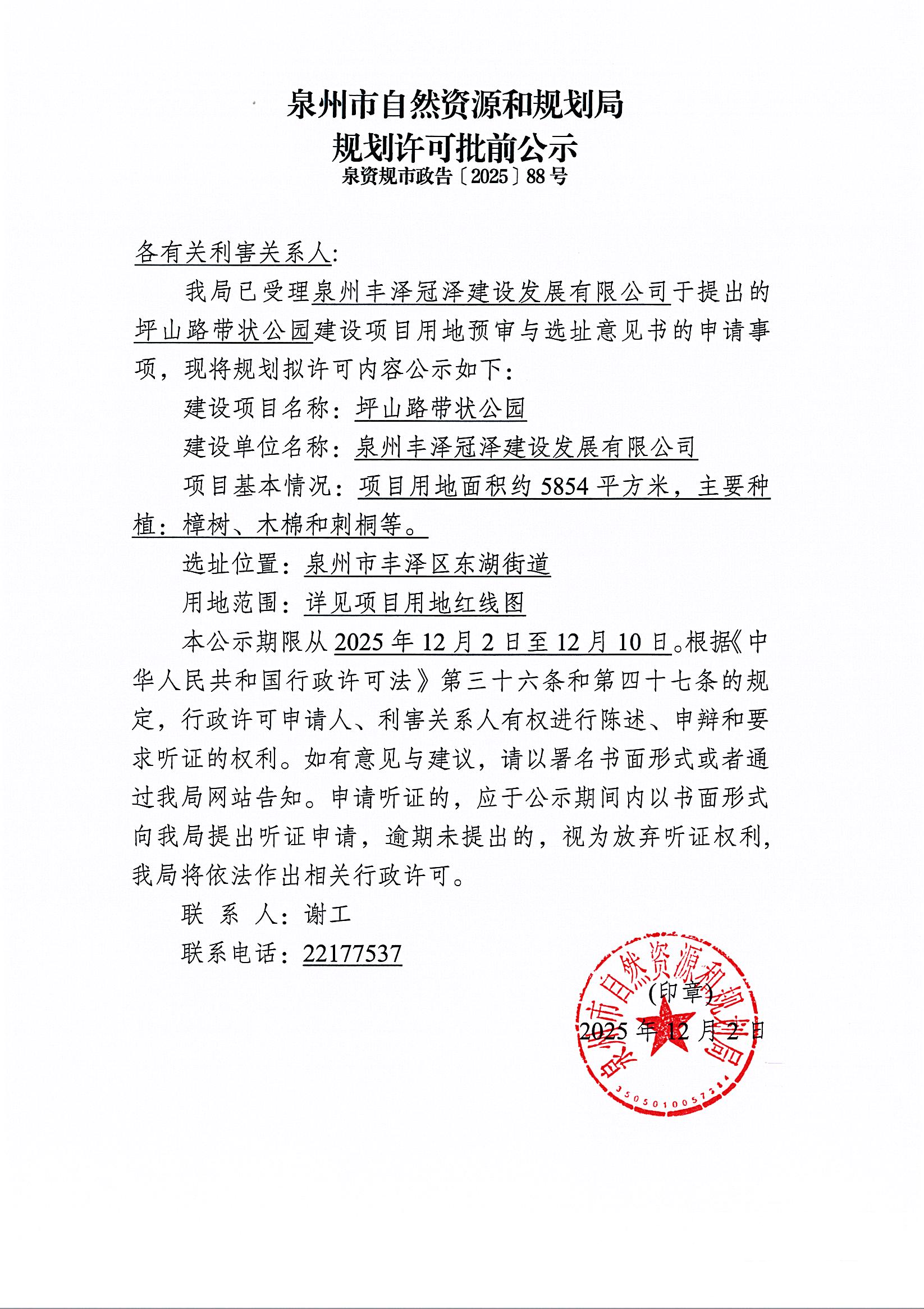 坪山路带状公园建设项目用地预审与选址意见书批前公示