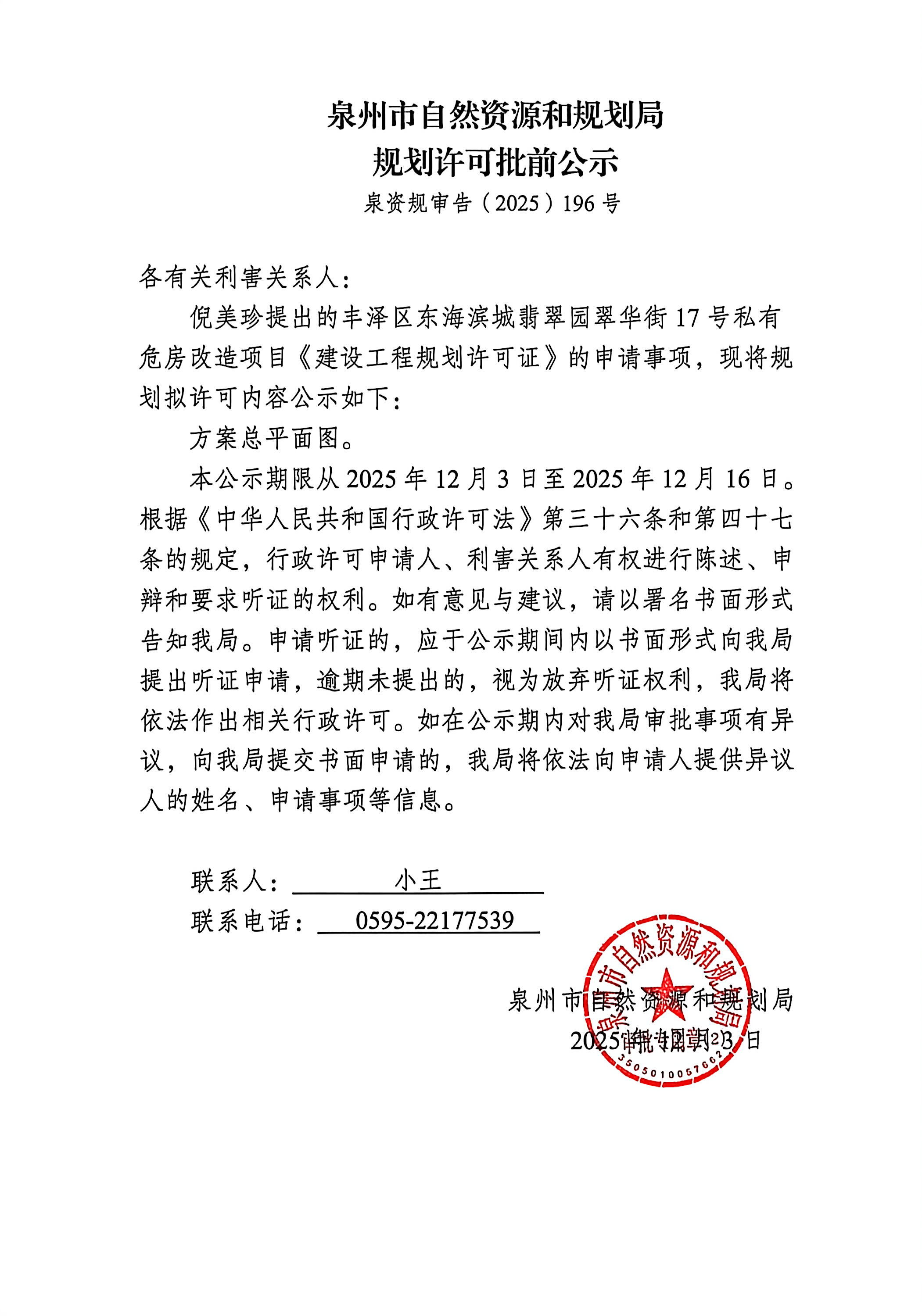 丰泽区东海滨城翡翠园翠华街17号私有危房改造项目《建设工程规划许可证》批前公示