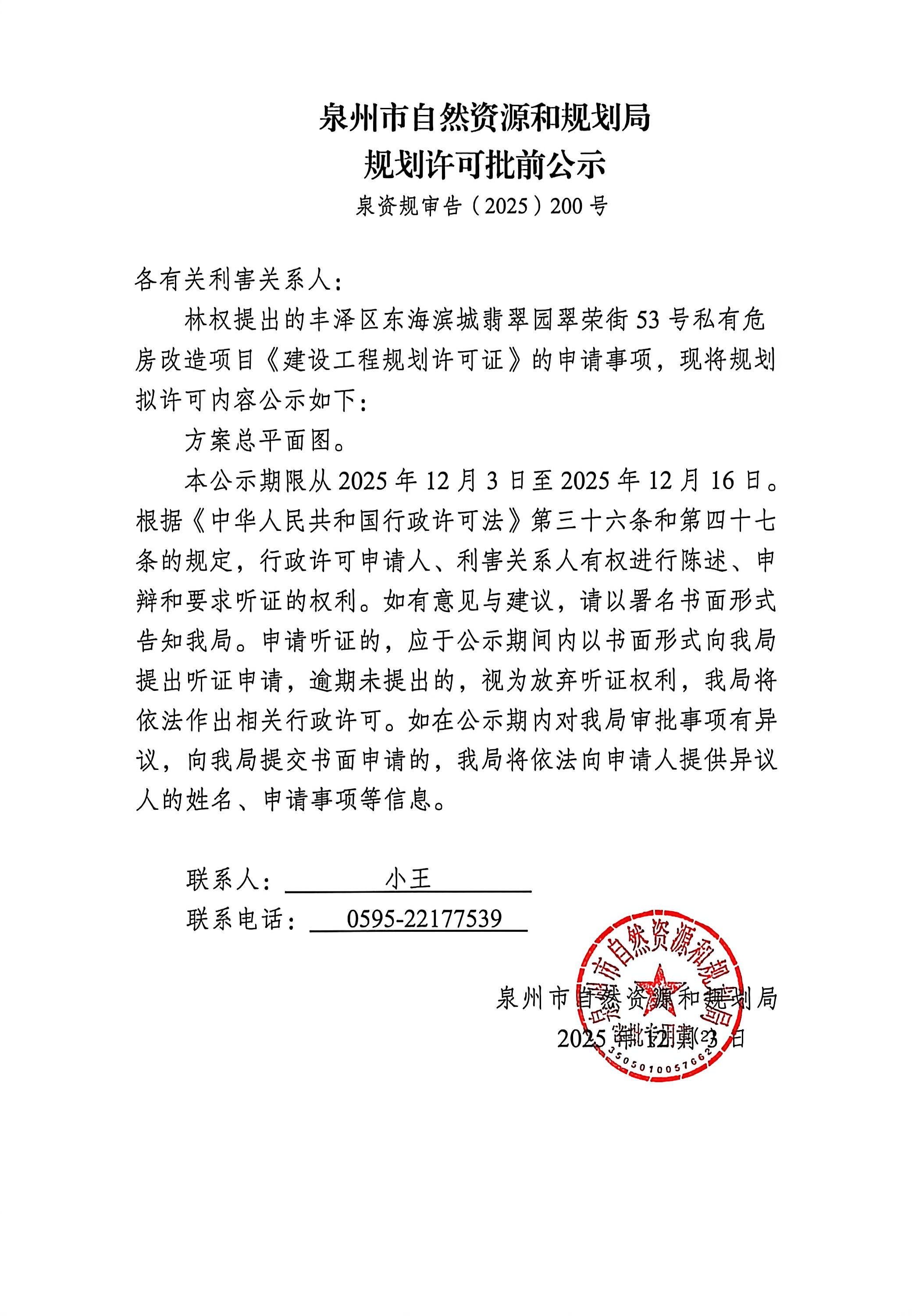 丰泽区东海滨城翡翠园翠荣街53号私有危房改造项目《建设工程规划许可证》批前公示