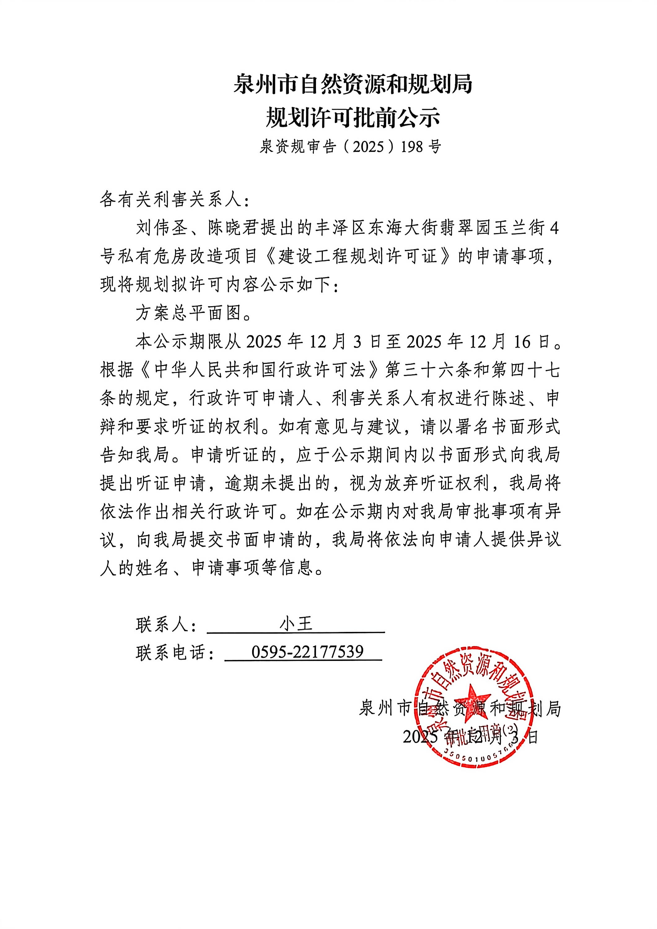 丰泽区东海大街翡翠园玉兰街4号私有危房改造项目《建设工程规划许可证》批前公示