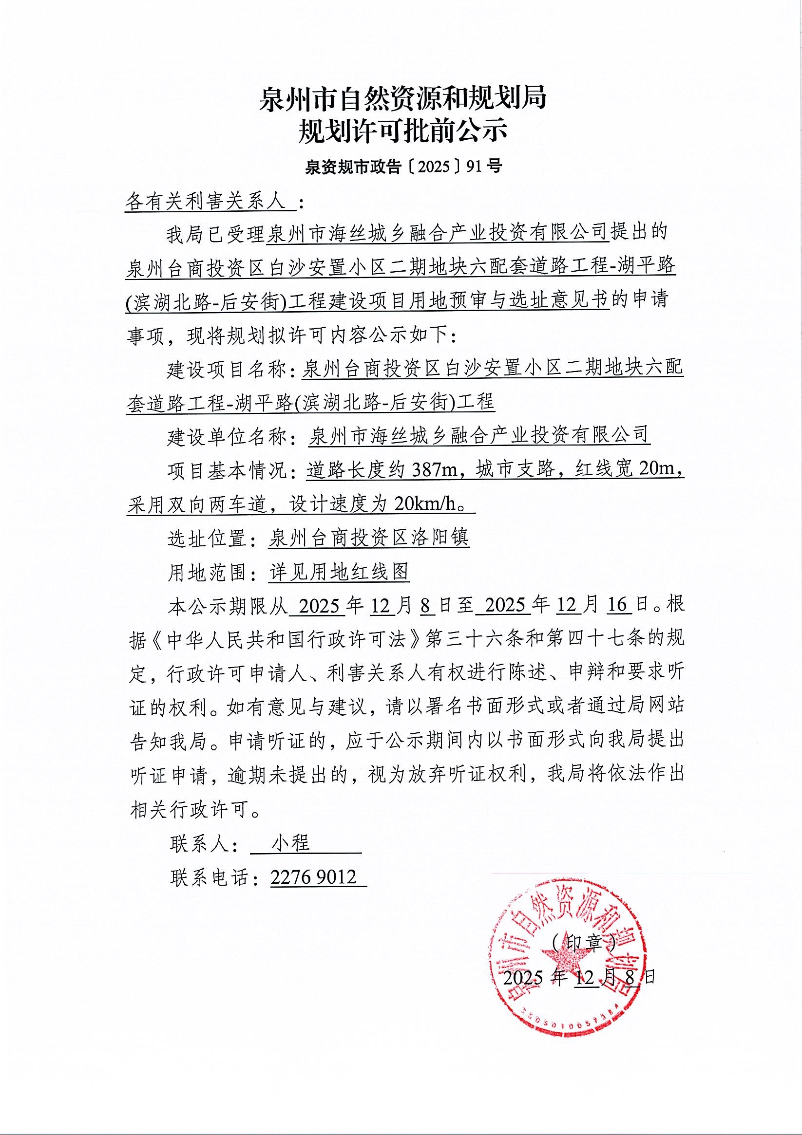 泉州台商投资区白沙安置小区二期地块六配套道路工程-湖平路(滨湖北路-后安街)工程建设项目用地预审与选址意见书批前公示
