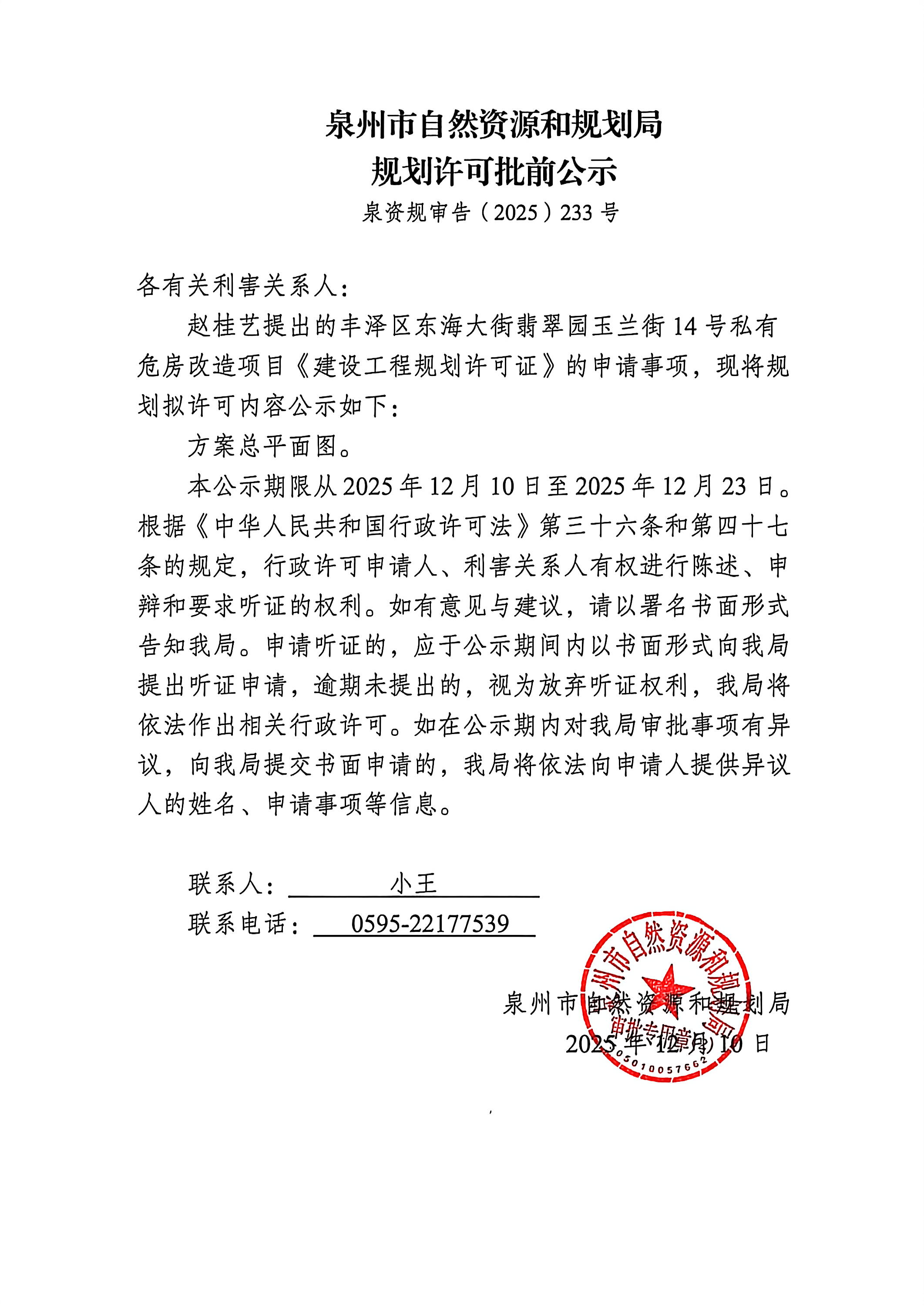 丰泽区东海大街翡翠园玉兰街14号私有危房改造项目《建设工程规划许可证》批前公示
