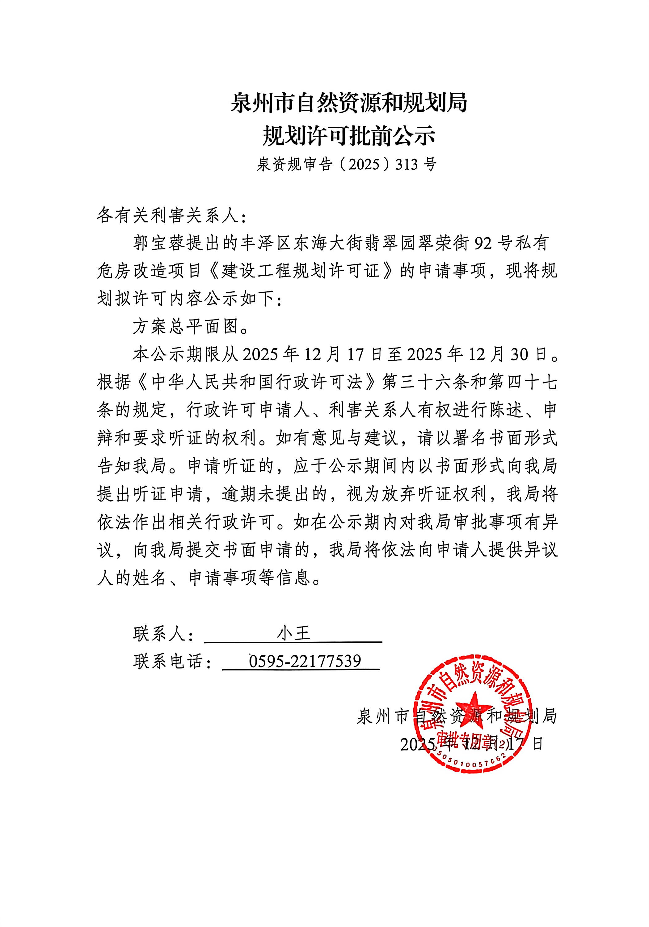 丰泽区东海大街翡翠园翠荣街92号私有危房改造项目《建设工程规划许可证》批前公示