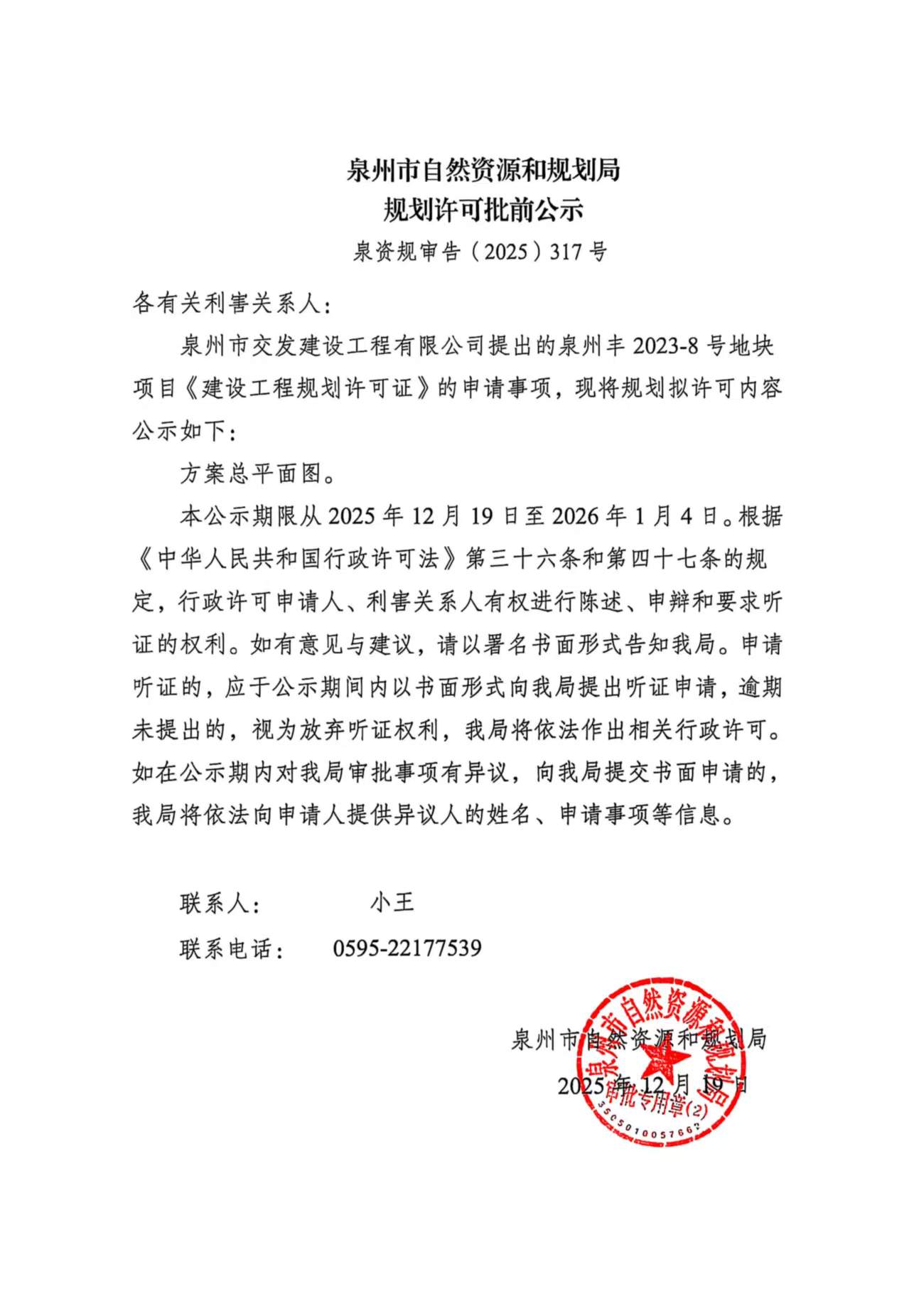 泉州丰2023-8号地块项目《建设工程规划许可证》批前公示