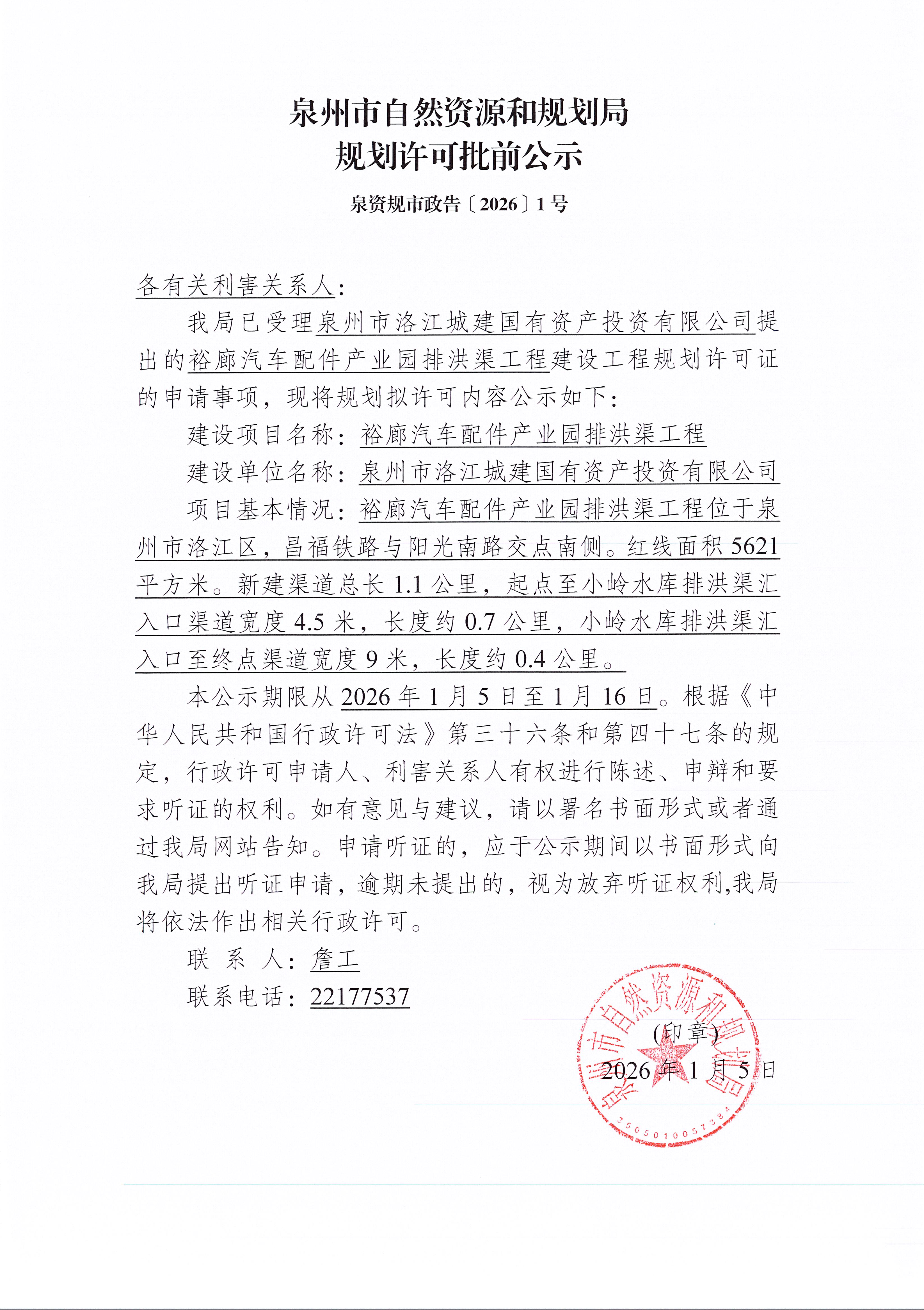 裕廊汽车配件产业园排洪渠工程建设工程规划许可证批前公示