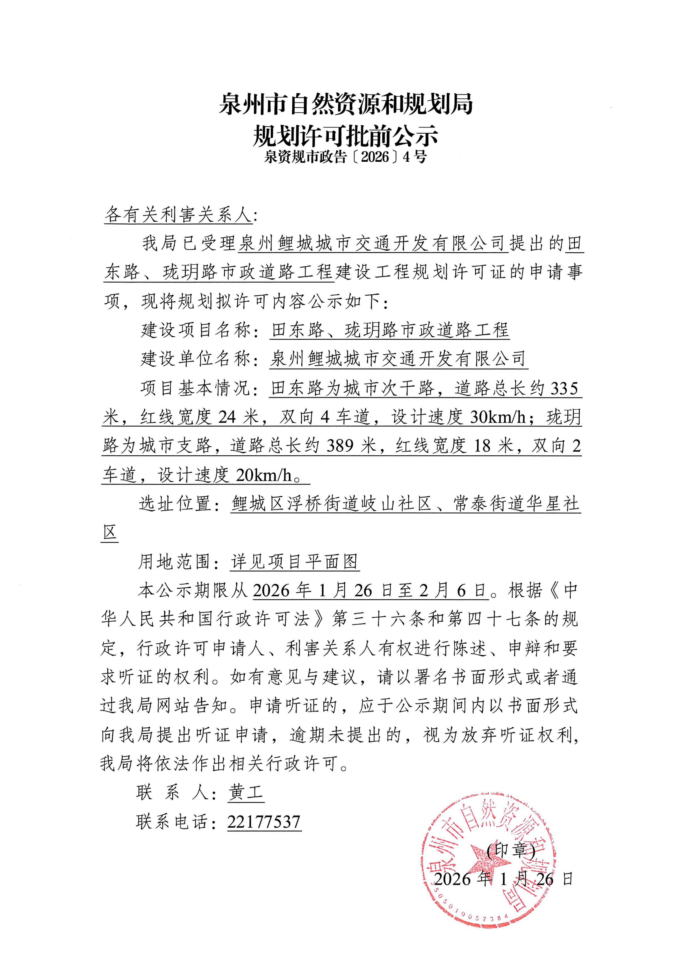 田东路、珑玥路市政道路工程建设工程规划许可证批前公示