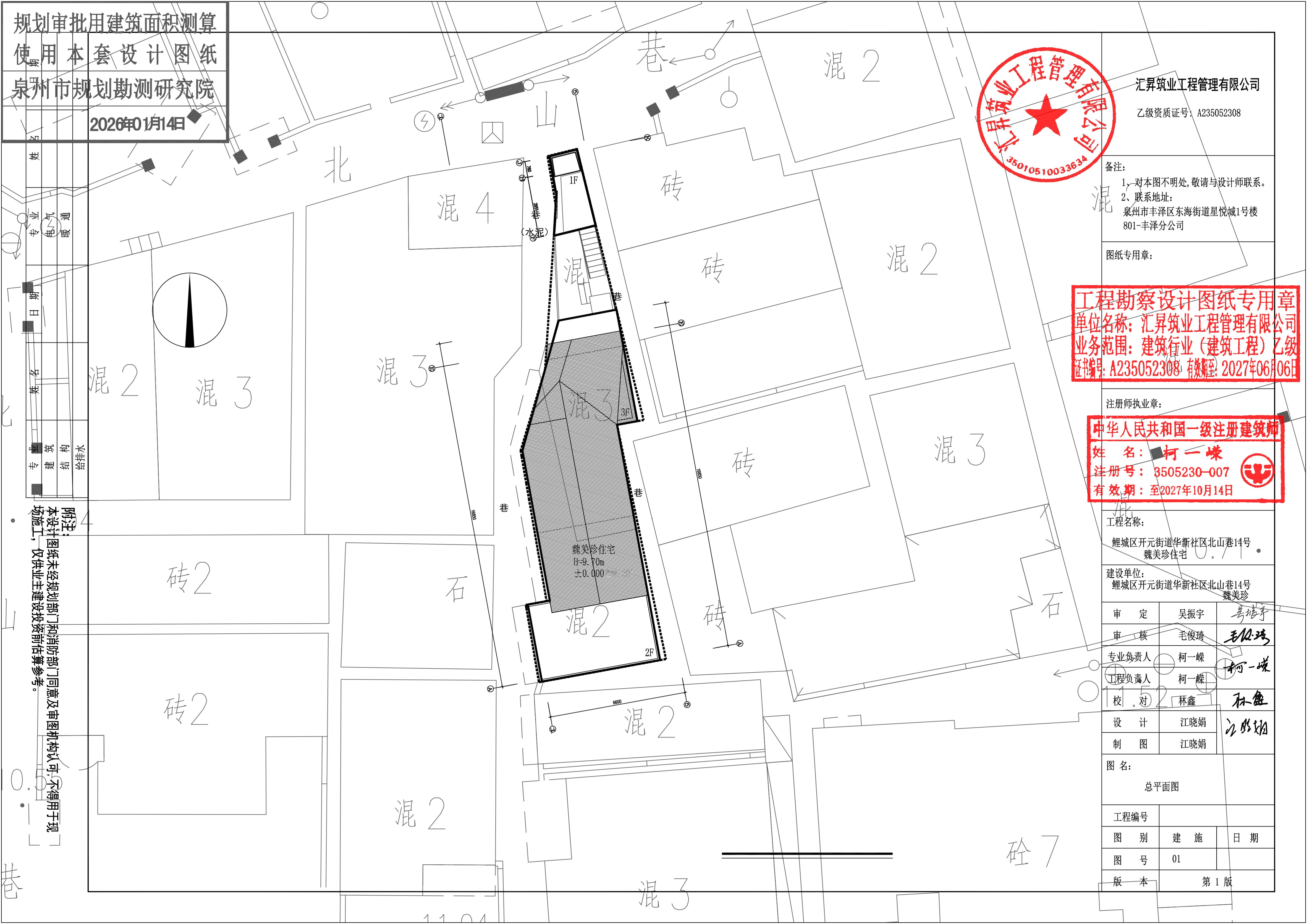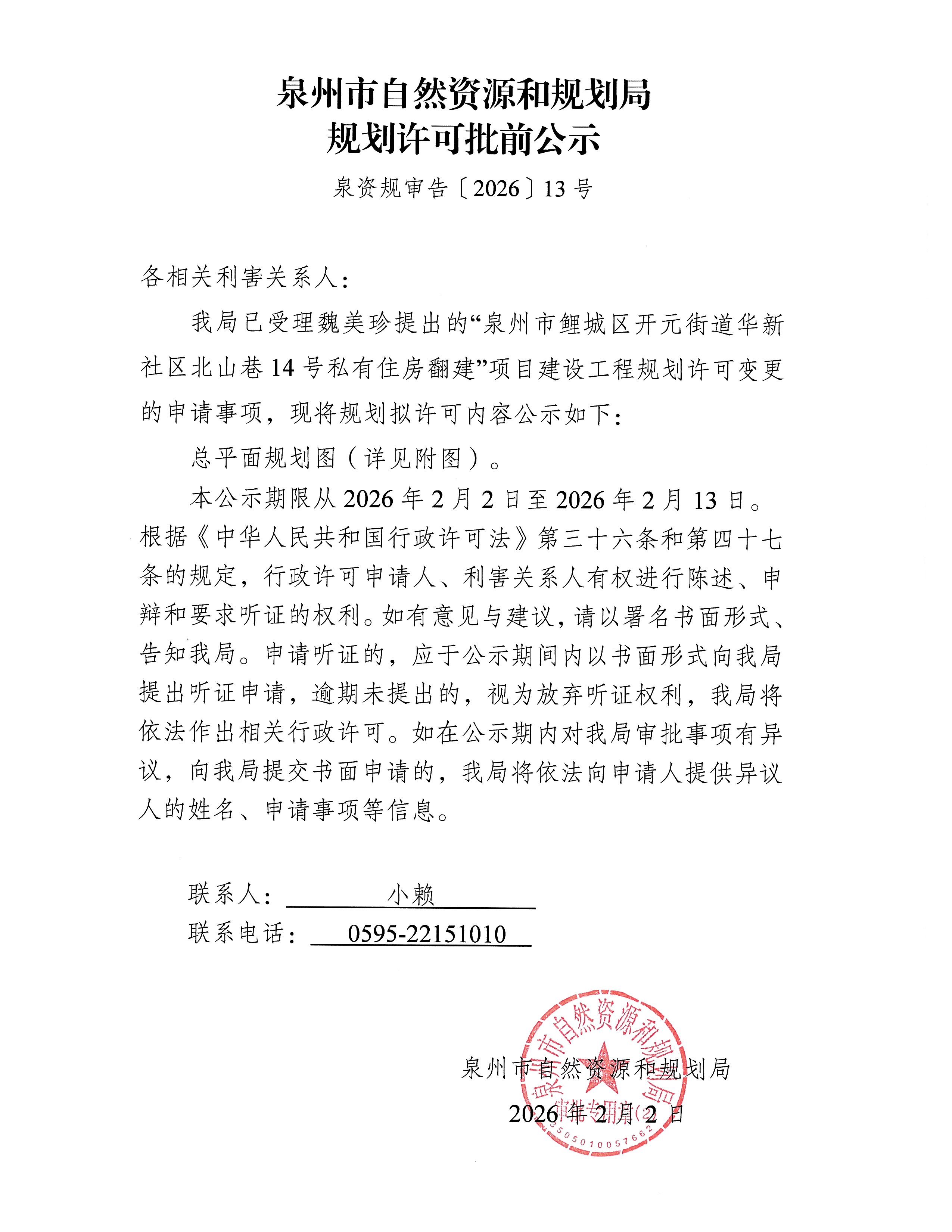 泉州市鲤城区开元街道华新社区北山巷14号私有住房翻建项目建设工程规划许可变更批前公示