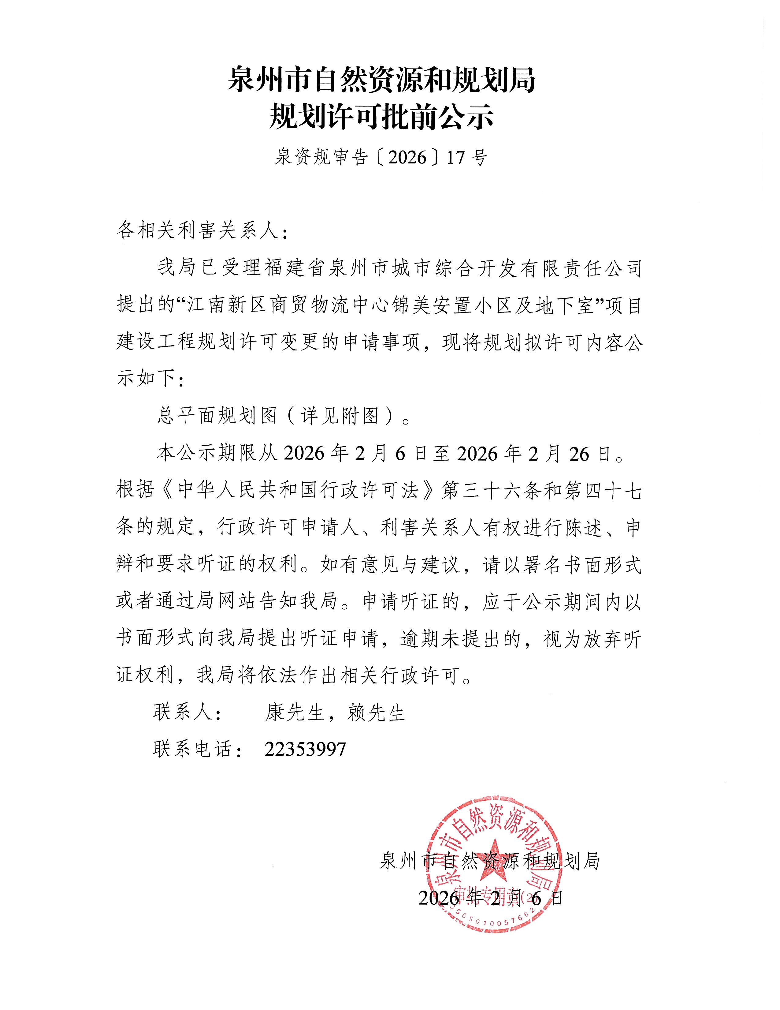 “江南新区商贸物流中心锦美安置小区及地下室”项目建设工程规划许可变更批前公示