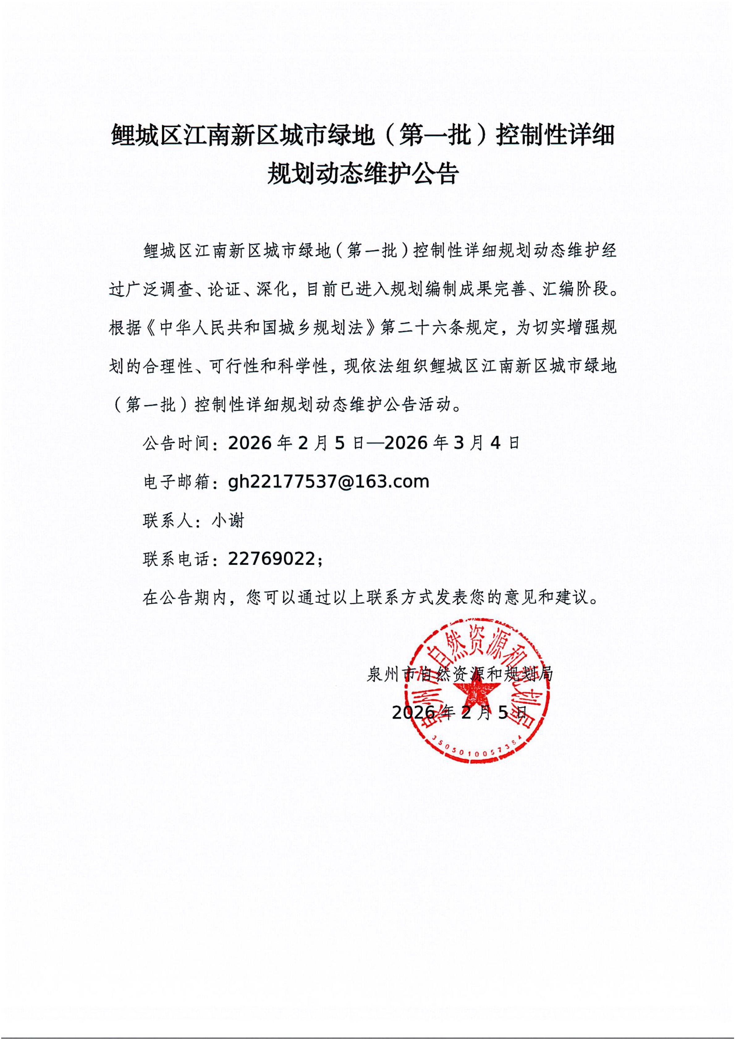 鲤城区江南新区城市绿地(第一批)控制性详细规划动态维护公告