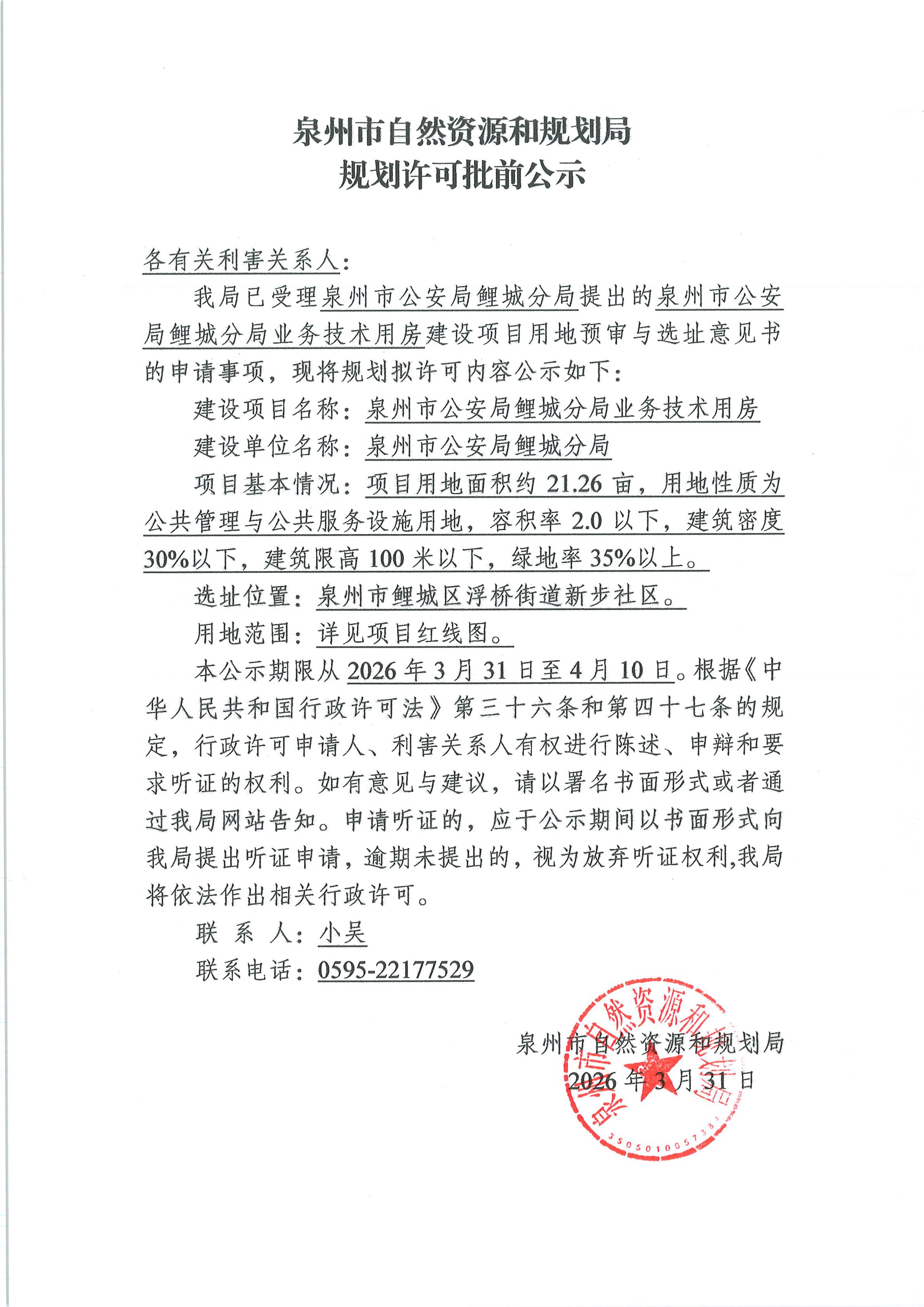 泉州市公安局鲤城分局业务技术用房建设项目用地预审与选址意见书批前公示