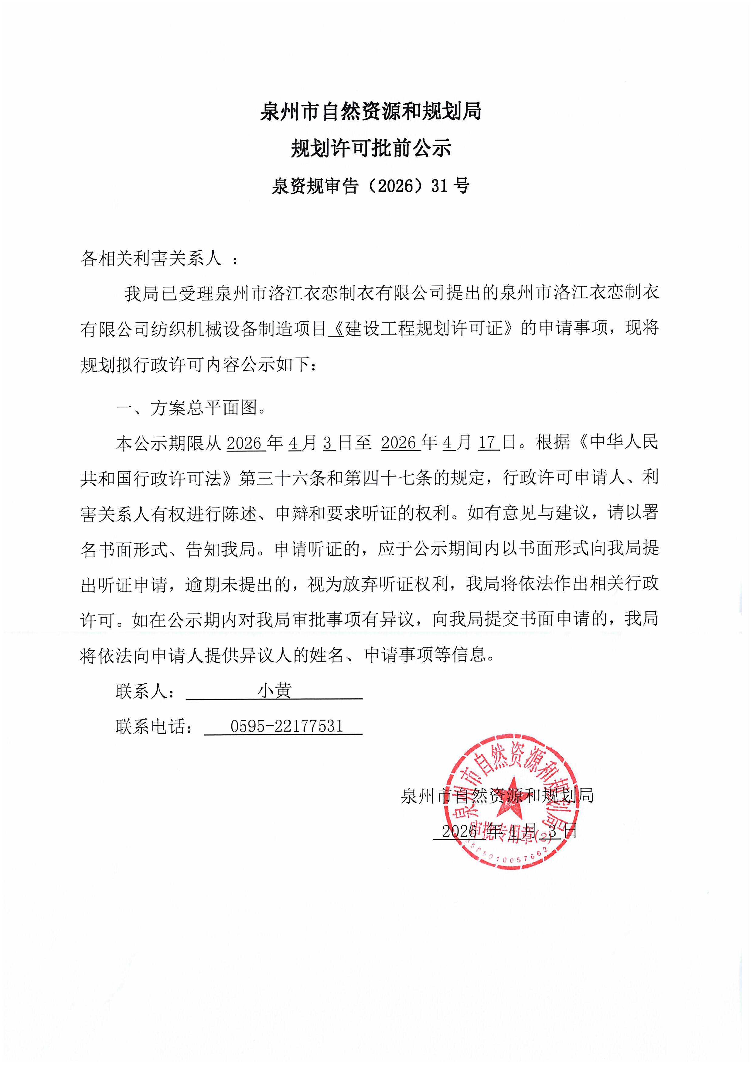 泉州市洛江衣恋制衣有限公司纺织机械设备制造项目《建设工程规划许可证》批前公示