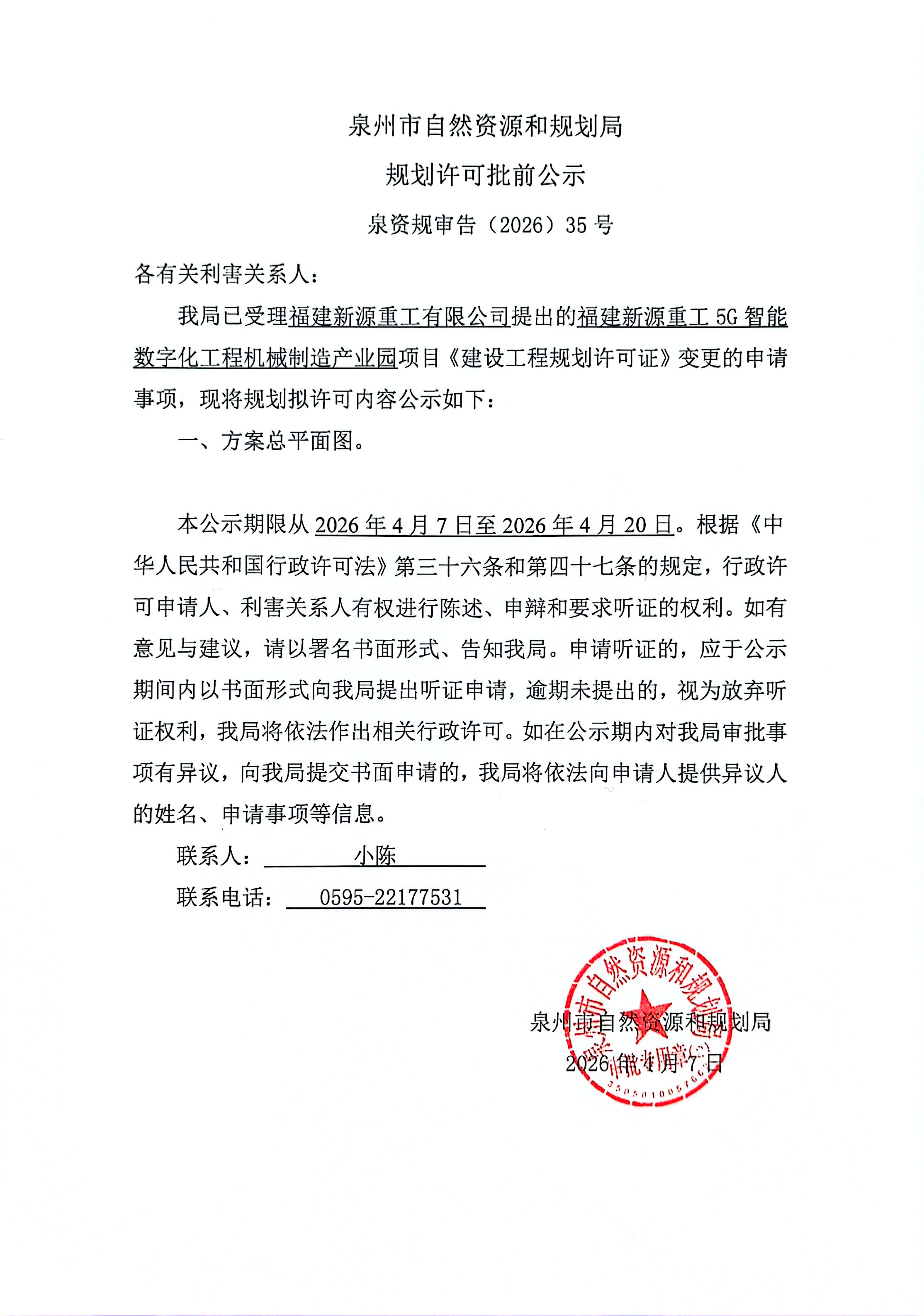 福建新源重工5G智能数字化工程机械制造产业园项目《建设工程规划许可证》变更批前公示