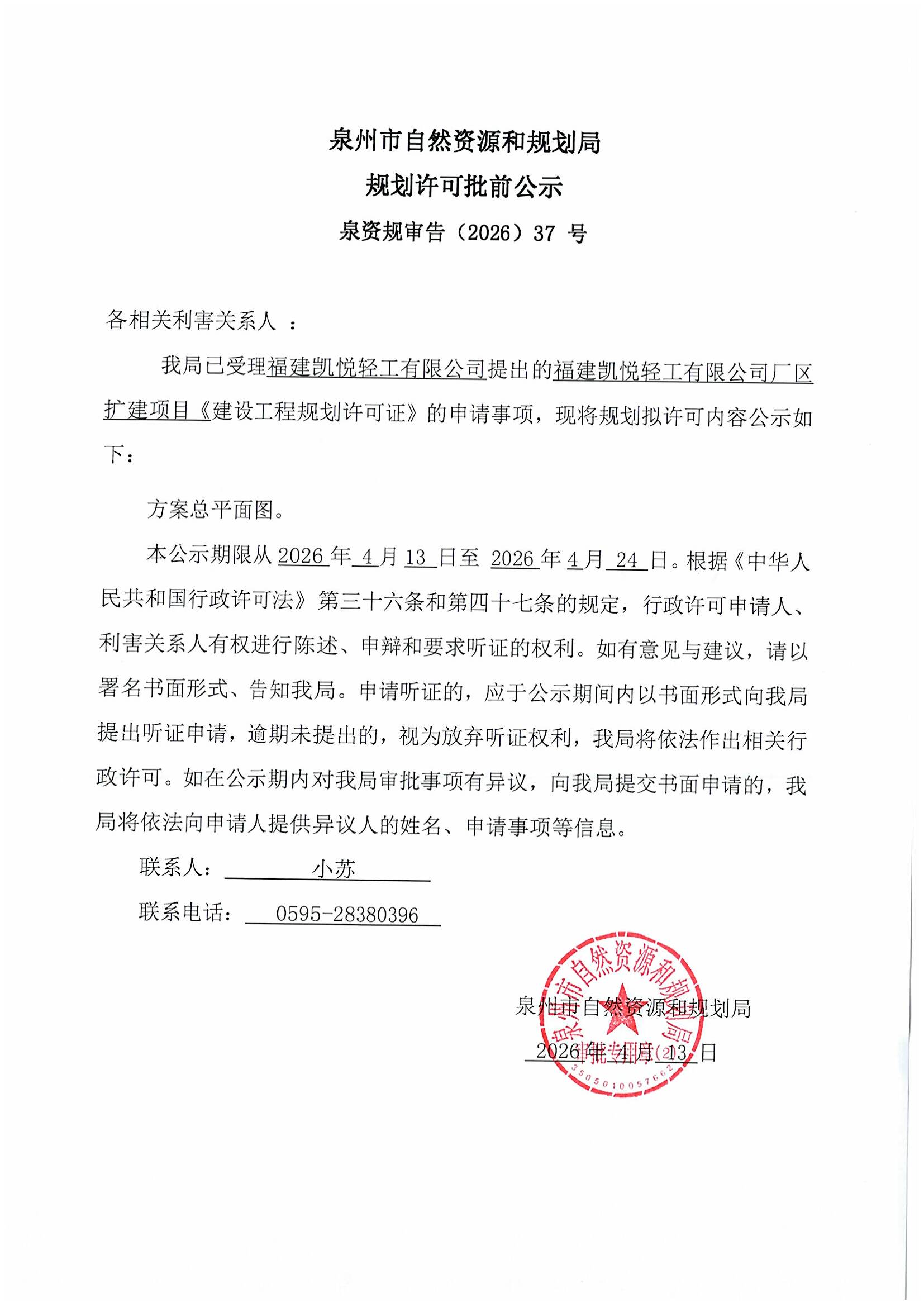 福建凯悦轻工有限公司厂区扩建项目《建设工程规划许可证》批前公示