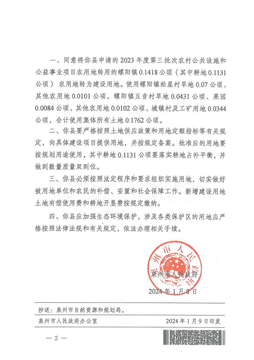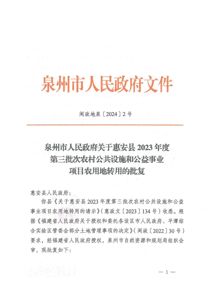 泉州市人民政府关于惠安县2023年度第三批次农村公共设施和公益事业项目农用地转用的批复