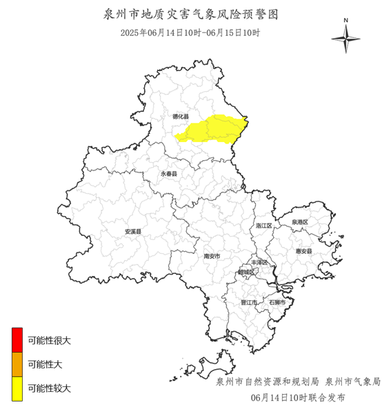 预计,6月14日10时至6月15日10时,德化县浔中镇、龙门滩镇、雷峰镇、南埕镇、水口镇、国宝乡,地质灾害气象风险等级为黄色预警,地质灾害发生可能性较大,应加强对地质灾害隐患点的监测和对高陡边坡、易发泥石流的沟口等易发区的巡查和防范,如果发现地灾险情应及时采取防灾避险措施,确保人民生命安全。
