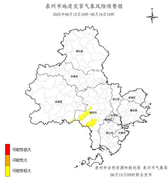 预计,6月15日10时至6月16日10时,安溪县龙门镇,南安市溪美街道、柳城街道、美林街道、仑苍镇、东田镇、英都镇、官桥镇,地质灾害气象风险等级为黄色预警,地质灾害发生可能性较大,应加强对地质灾害隐患点的监测和对高陡边坡、易发泥石流的沟口等易发区的巡查和防范,如果发现地灾险情应及时采取防灾避险措施,确保人民生命安全。