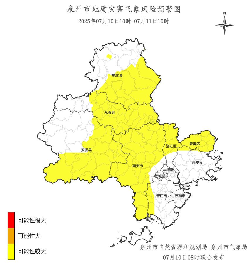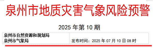 预计,07月10日10时至07月11日10时,洛江区罗溪镇、马甲镇、河市镇、虹山乡,泉港区山腰街道、南埔镇、界山镇、后龙镇、峰尾镇、前黄镇、涂岭镇,惠安县紫山镇、东桥镇、辋川镇,安溪县凤城镇、蓬莱镇、湖头镇、官桥镇、剑斗镇、城厢镇、金谷镇、龙门镇、虎邱镇、芦田镇、魁斗镇、西坪镇、参内镇、白濑乡、湖上乡、尚卿乡、大坪乡、龙涓乡、蓝田乡、祥华乡,永春县桃城镇、五里街道、下洋镇、蓬壶镇、达埔镇、吾峰镇、石鼓镇、岵山镇、东平镇、湖洋镇、坑仔口镇、玉斗镇、锦斗镇、东关镇、桂洋镇、苏坑镇、仙夹镇、呈祥镇、介福乡、外山乡,德化县浔中镇、龙浔镇、三班镇、龙门滩镇、雷峰镇、南埕镇、水口镇、赤水镇、上涌镇、盖德镇、美湖镇、汤头乡、桂阳乡、国宝乡,晋江市安海镇、磁灶镇、内坑镇、东石镇,南安市溪美街道、柳城街道、美林街道、省新镇、仑苍镇、东田镇、英都镇、翔云镇、金淘镇、诗山镇、蓬华镇、码头镇、九都镇、乐峰镇、罗东镇、梅山镇、洪濑镇、洪梅镇、康美镇、丰州镇、霞美镇、官桥镇、水头镇、石井镇、眉山乡、向阳乡等地部分地区地质灾害发生的可能性较大(黄色预警),应加强对地质灾害隐患点的监测和对高陡边坡、易发泥石流的沟口等易发区的巡查和防范,如果发现地灾险情应及时采取防灾避险措施,确保人民生命安全。