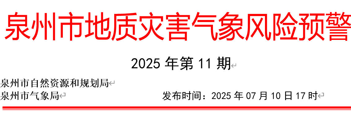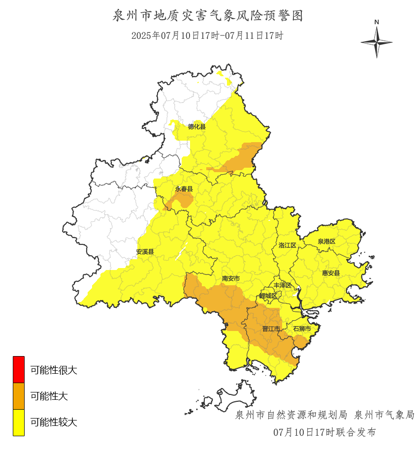 预计,07月10日17时至07月11日17时,安溪县湖头镇、龙门镇、白濑乡,永春县蓬壶镇、达埔镇、玉斗镇、介福乡,德化县龙浔镇、三班镇、龙门滩镇、南埕镇,石狮市湖滨街道、凤里街道、灵秀镇、宝盖镇、蚶江镇、锦尚镇、永宁镇,晋江市青阳街道、梅岭街道、西园街道、罗山街道、灵源街道、新塘街道、陈埭镇、池店镇、安海镇、磁灶镇、内坑镇、紫帽镇、东石镇、永和镇、英林镇、龙湖镇、深沪镇,南安市溪美街道、柳城街道、东田镇、英都镇、翔云镇、霞美镇、官桥镇、水头镇等地部分地区地质灾害发生的可能性大(橙色预警),应做好值班值守、监测、巡查和防范,应按有关规定及时组织危险性较大的地灾隐患点和危险区域内的群众转移,确保人民生命安全。