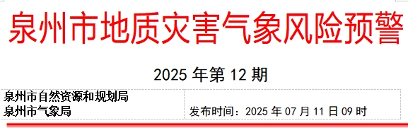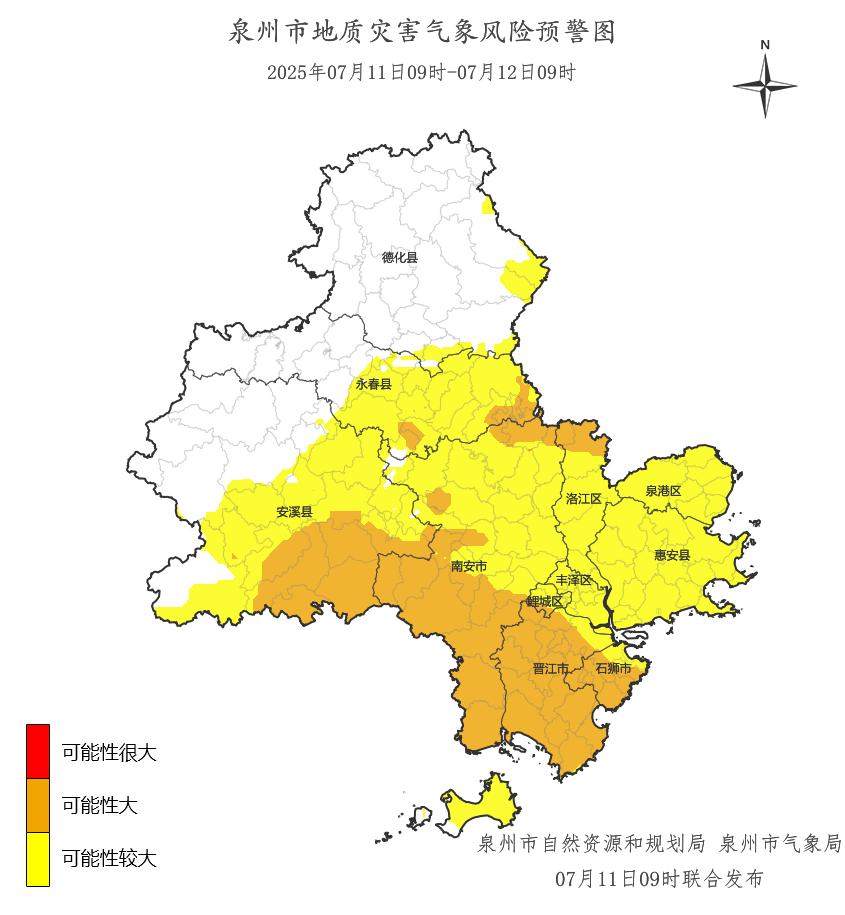 预计,07月11日09时至07月12日09时,鲤城区金龙街道,洛江区罗溪镇、虹山乡,安溪县蓬莱镇、官桥镇、城厢镇、龙门镇、虎邱镇、芦田镇、西坪镇、参内镇、尚卿乡、大坪乡,永春县桃城镇、达埔镇、岵山镇、湖洋镇、东关镇、仙夹镇、外山乡,石狮市湖滨街道、凤里街道、灵秀镇、宝盖镇、蚶江镇、祥芝镇、鸿山镇、锦尚镇、永宁镇,晋江市青阳街道、梅岭街道、西园街道、罗山街道、灵源街道、新塘街道、陈埭镇、池店镇、安海镇、磁灶镇、内坑镇、紫帽镇、东石镇、永和镇、英林镇、金井镇、龙湖镇、深沪镇、西滨镇,南安市溪美街道、柳城街道、美林街道、省新镇、仑苍镇、东田镇、英都镇、翔云镇、金淘镇、九都镇、乐峰镇、霞美镇、官桥镇、水头镇、石井镇、眉山乡、向阳乡等地部分地区地质灾害发生的可能性大(橙色预警),应做好值班值守、监测、巡查和防范,应按有关规定及时组织危险性较大的地灾隐患点和危险区域内的群众转移,确保人民生命安全。