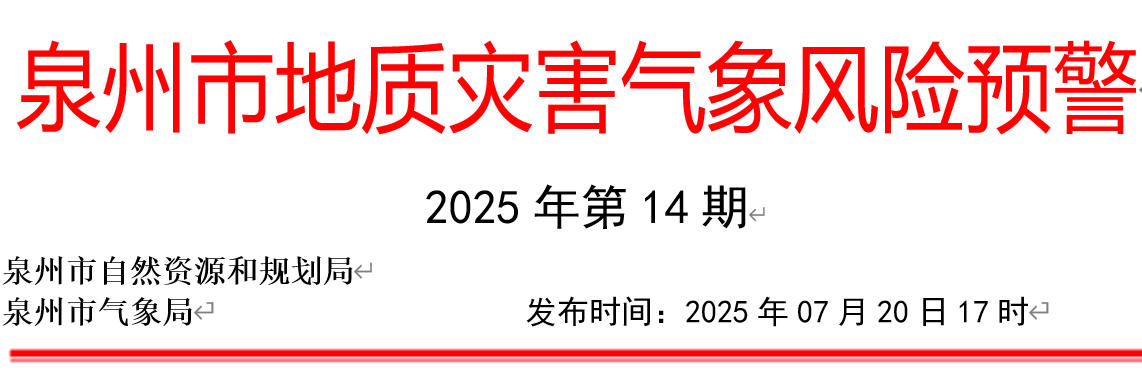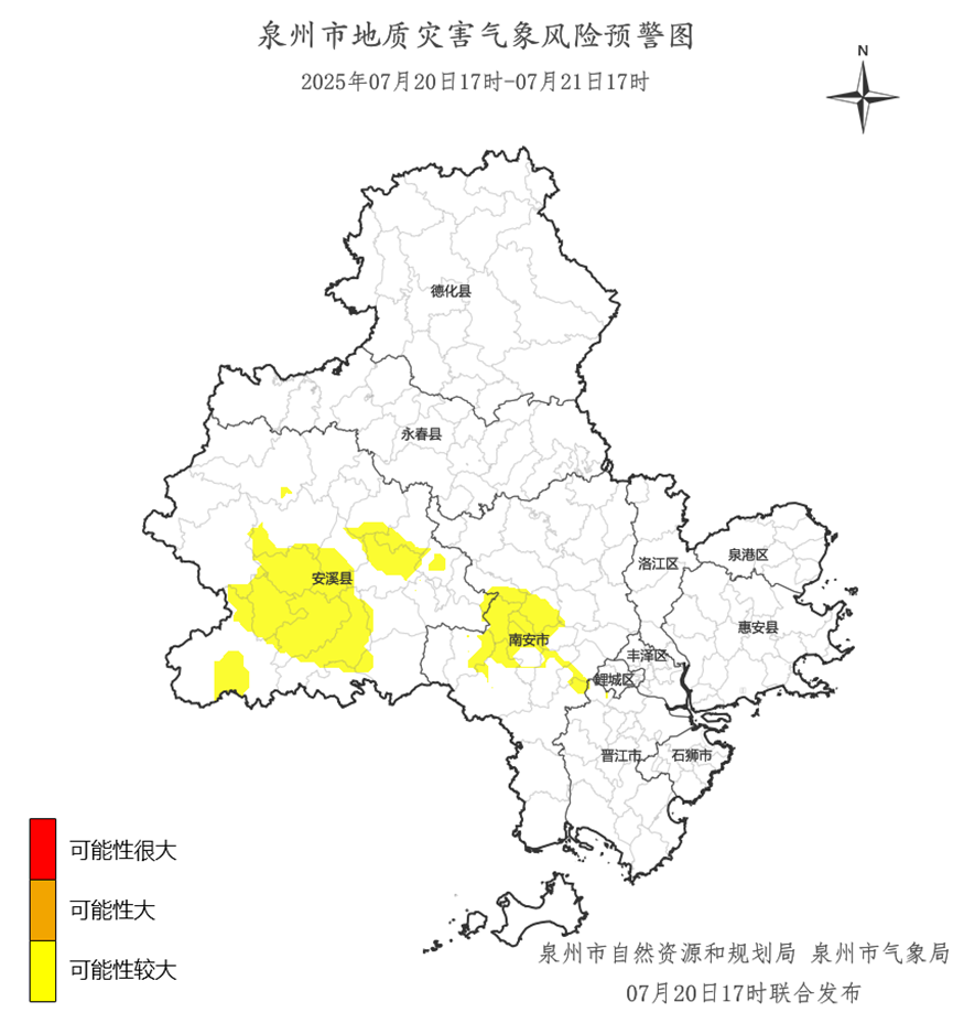 预计,07月20日17时至07月21日17时,安溪县蓬莱镇、湖头镇、官桥镇、城厢镇、金谷镇、龙门镇、虎邱镇、芦田镇、感德镇、魁斗镇、西坪镇、参内镇、尚卿乡、大坪乡、龙涓乡、长卿镇、蓝田乡、祥华乡,晋江市紫帽镇,南安市溪美街道、柳城街道、美林街道、省新镇、仑苍镇、东田镇、英都镇、金淘镇、康美镇、霞美镇、官桥镇、眉山乡等地部分地区地质灾害发生的可能性较大(黄色预警),应加强对地质灾害隐患点的监测和对高陡边坡、易发泥石流的沟口等易发区的巡查和防范,如果发现地灾险情应及时采取防灾避险措施,确保人民生命安全。