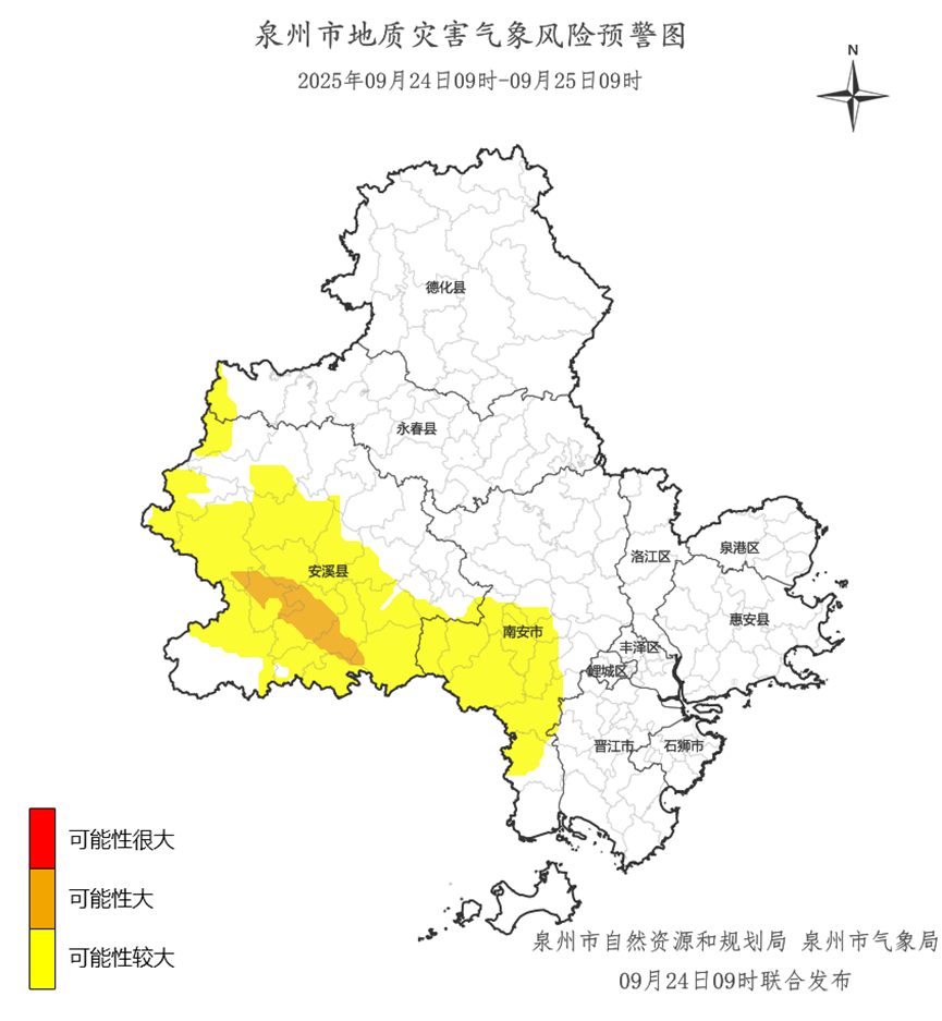 预计,09月24日09时至09月25日09时,安溪县龙门镇、虎邱镇、芦田镇、西坪镇、大坪乡、蓝田乡、祥华乡等地部分地区地质灾害发生的可能性大(橙色预警);蓬莱镇、官桥镇、城厢镇、感德镇、参内镇、湖上乡、尚卿乡、龙涓乡、长卿镇、桃舟乡、福田乡,永春县一都镇,晋江市磁灶镇、内坑镇,南安市溪美街道、柳城街道、美林街道、省新镇、仑苍镇、东田镇、英都镇、翔云镇、霞美镇、官桥镇、水头镇等地部分地区地质灾害发生的可能性较大(黄色预警)。