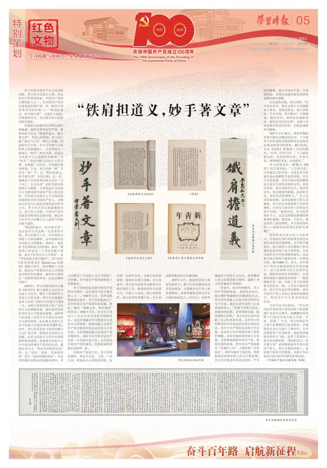 李大钊是中国共产主义运动的先驱,伟大的马克思主义者,杰出的无产阶级革命家,中国共产党的主要创始人之一。在中国共产党历史展览馆的展厅里,有一副李大钊亲笔书写的对联——“铁肩担道义,妙手著文章”,立意宏大深远,字体刚劲有力,每天都引来大批观众驻足观看。