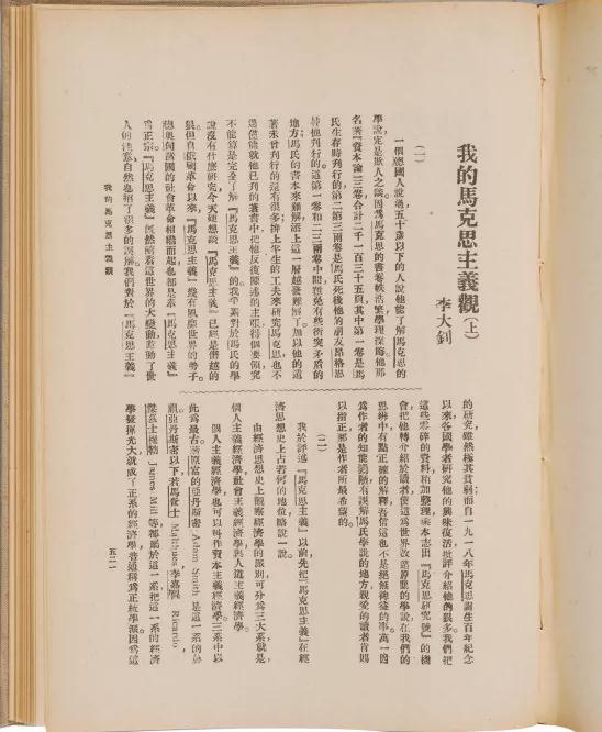1919年,李大钊将其担任主编的《新青年》第六卷第五号定为马克思主义专号,集中了多篇研究马克思主义的文章,其中尤为重要的是李大钊的《我的马克思主义观》一文。这篇文章系统地介绍了马克思主义的唯物史观、政治经济学和科学社会主义的基本原理,表明李大钊完成了从民主主义者向马克思主义者的转变,标志着马克思主义在中国进入比较系统的传播阶段。此外,李大钊还发表《再论问题与主义》等文章,批驳反马克思主义思潮,论证马克思主义符合中国需要的深刻道理。他重视马克思主义在中国具体情况下的实际运用,强调社会主义“用以为实际的运动”时,会“因时、因所、因事的性质”发生“适应环境的变化”。在北洋军阀反动统治的艰难环境中,李大钊推动了马克思主义在中国的广泛传播,为中国共产党创建准备了思想条件。